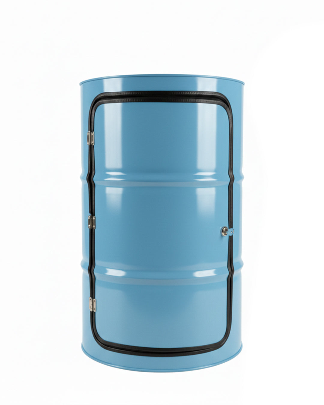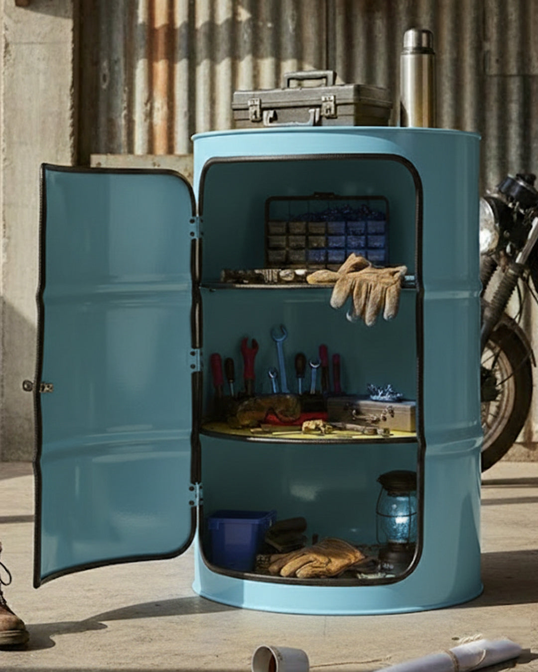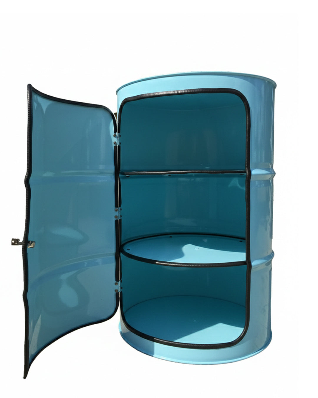 Mavi renkli metal varil dolap, 90 cm yüksekliği ve 60 cm çapı ile kompakt ve işlevsel bir depolama çözümü sunar.