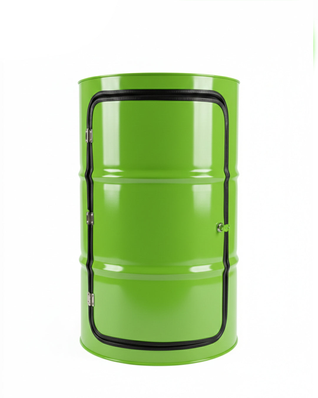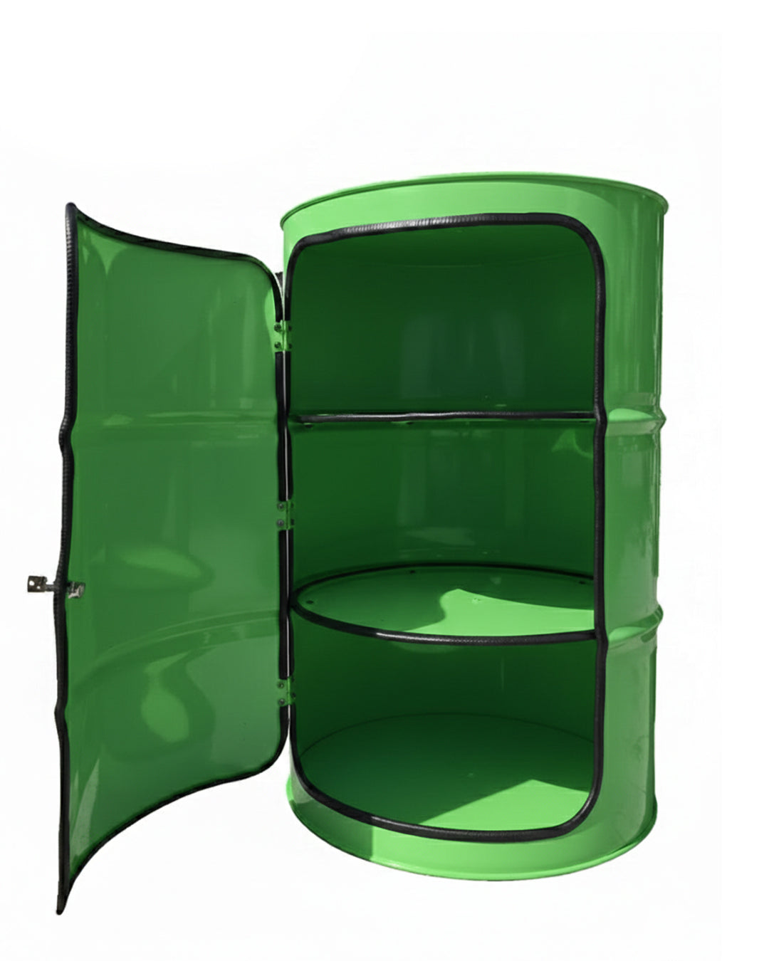 Yeşil metal varil dolap, endüstriyel tasarımı ile hem dekoratif hem işlevseldir. 90 cm yüksekliği ve 60 cm çapı ile kompakt alanlarda rahat kullanım sunar.