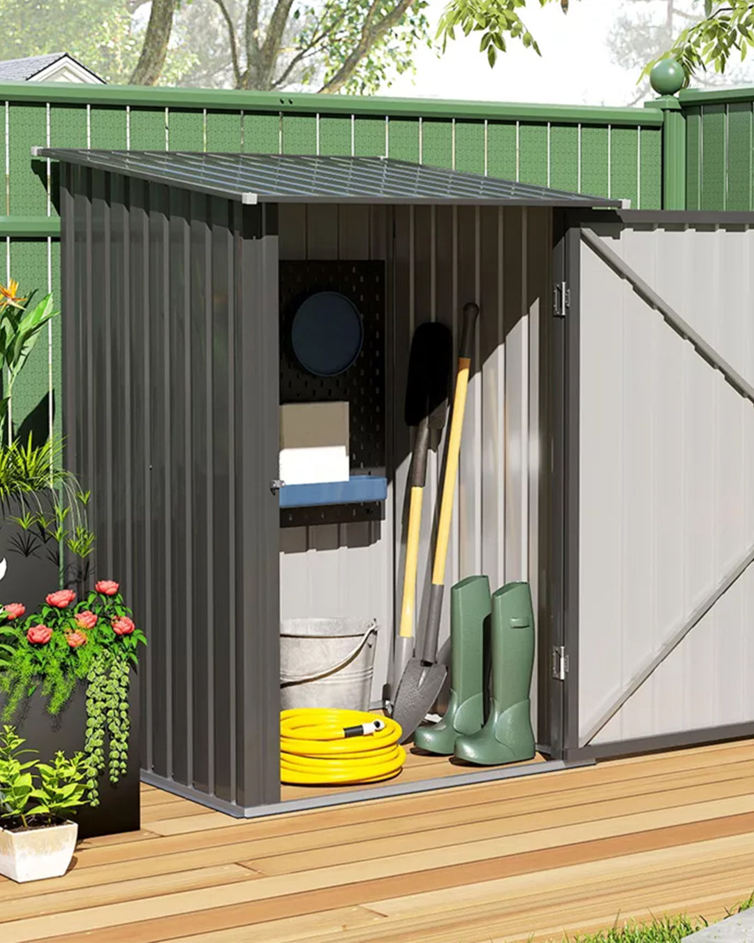 Geniş iç hacmi ve yüksek gövde yapısıyla kapsamlı bir depolama çözümü sunan ürün, bahçe düzenini pratik hale getiren dengeli ölçülere sahiptir; 104 cm genişliği, 99 cm derinliği ve 160 cm yüksekliği sayesinde büyük hacimli ekipmanların rahatlıkla saklanmasına imkân tanırken, dikey formu ile alanı verimli kullanarak bulunduğu ortamda düzenli ve güçlü bir depolama alanı oluşturur.