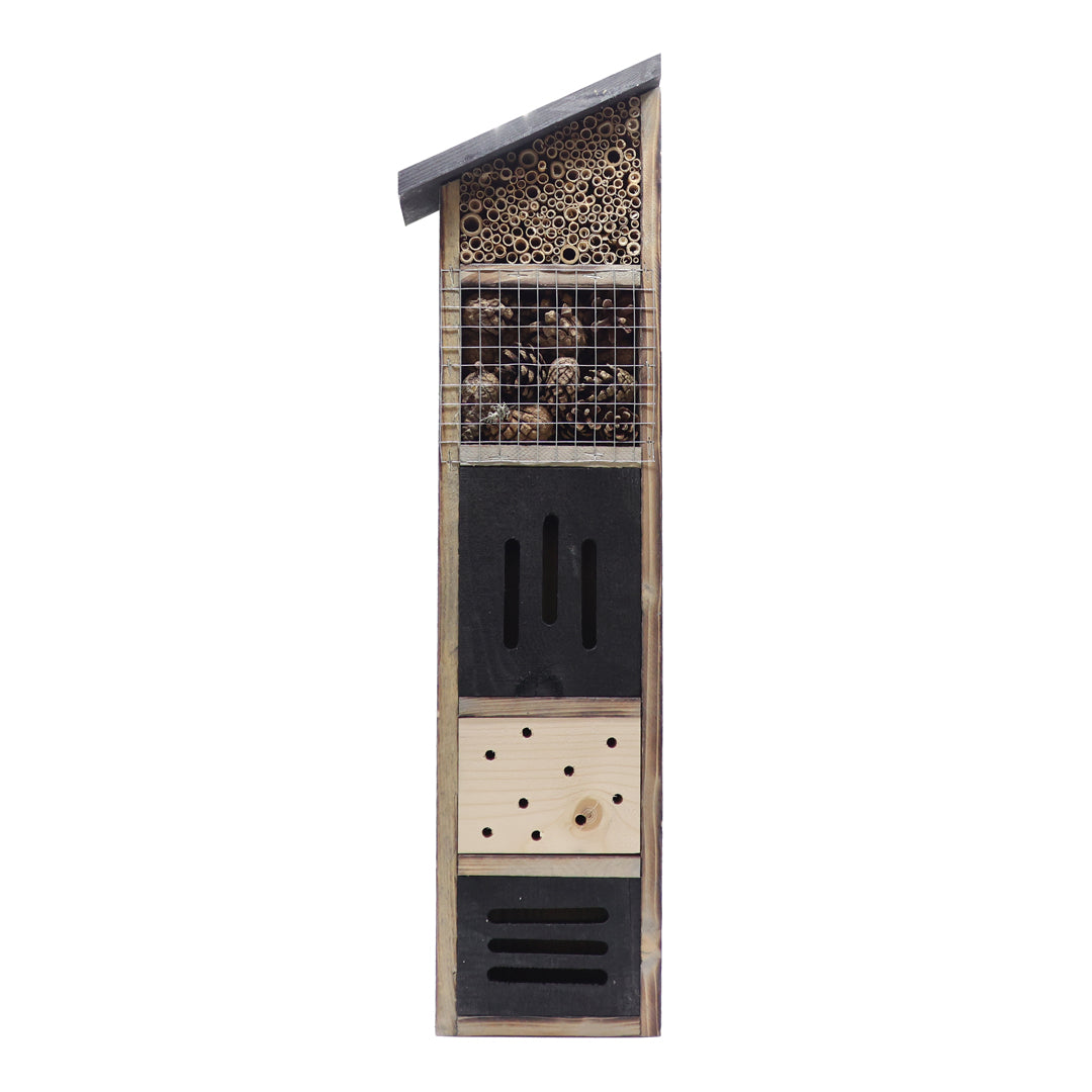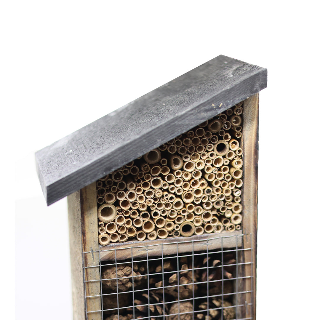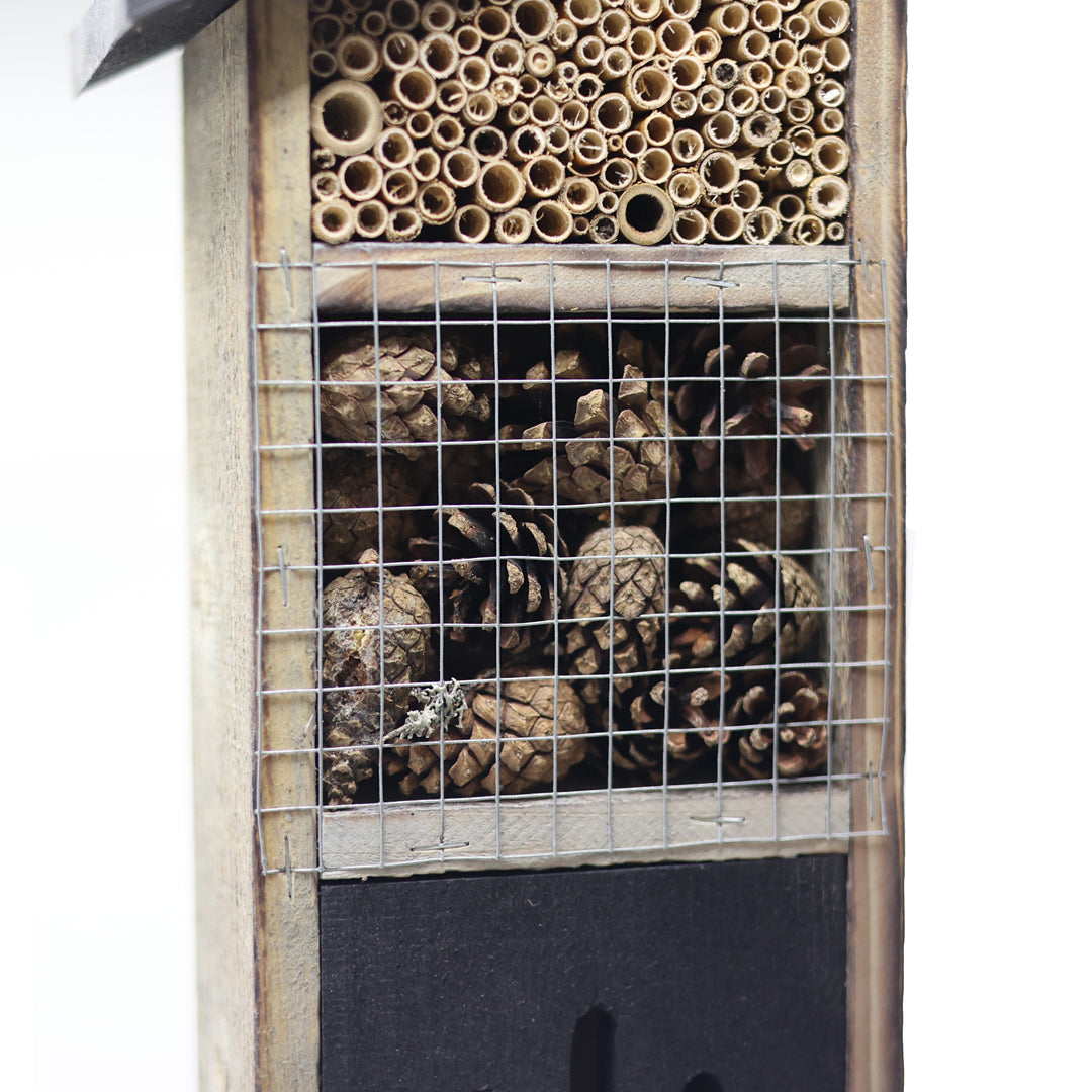 Bu böcek oteli farklı türlerin konaklamasına uygun çeşitli odacıklar içerir; bu sayede arılar, uğur böcekleri, kelebekler gibi faydalı böcekler için güvenli bir yaşam alanı oluşturur.