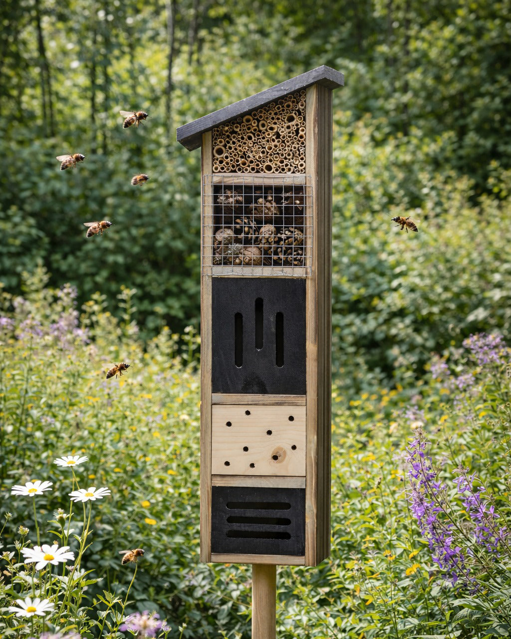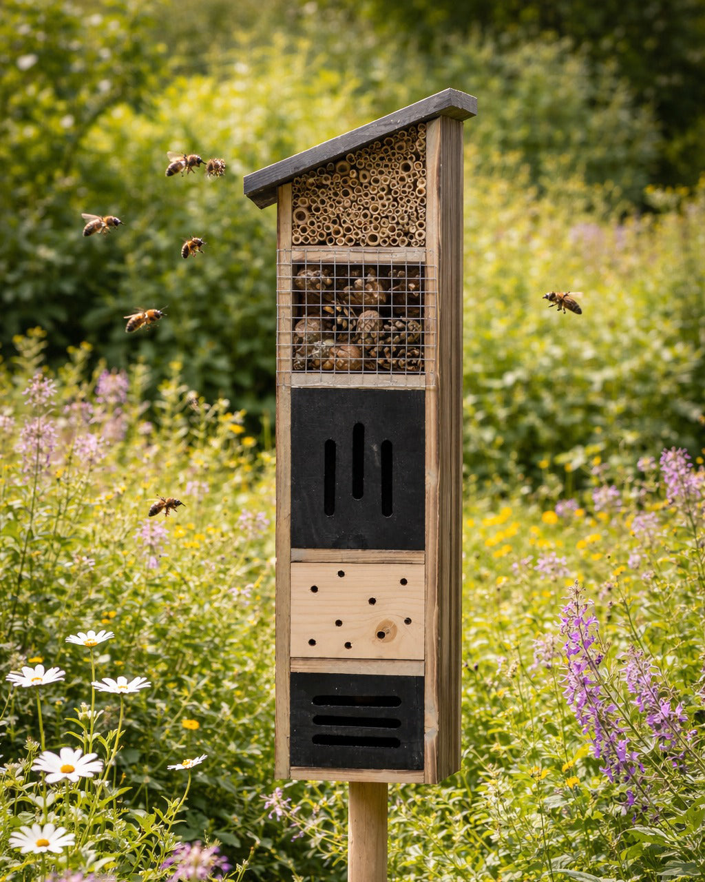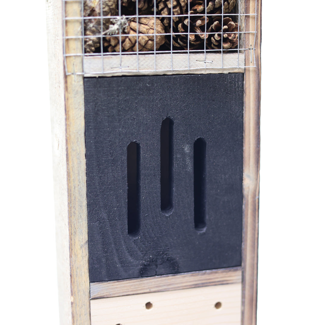 Bu böcek oteli farklı türlerin konaklamasına uygun çeşitli odacıklar içerir; bu sayede arılar, uğur böcekleri, kelebekler gibi faydalı böcekler için güvenli bir yaşam alanı oluşturur.