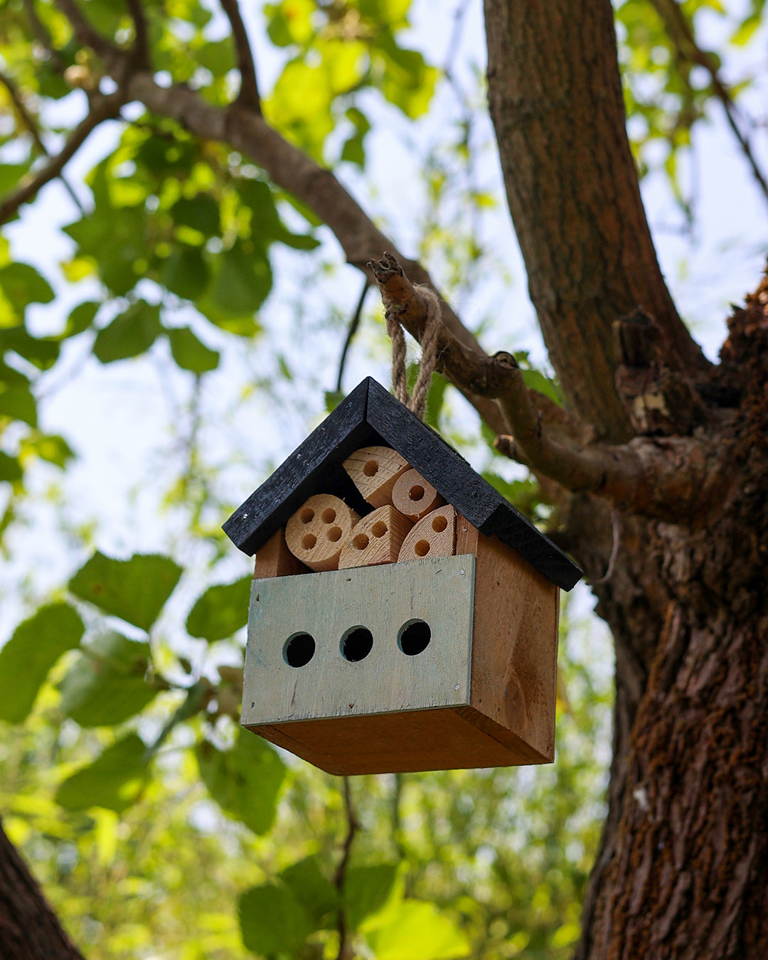 Bu böcek otelinin öne çıkan özelliği doğal ahşap yapısı ile iç içe geçmiş yuva bölmeleri sayesinde farklı böcek türleri için güvenli ve sıcak bir yaşam alanı sunmasıdır.