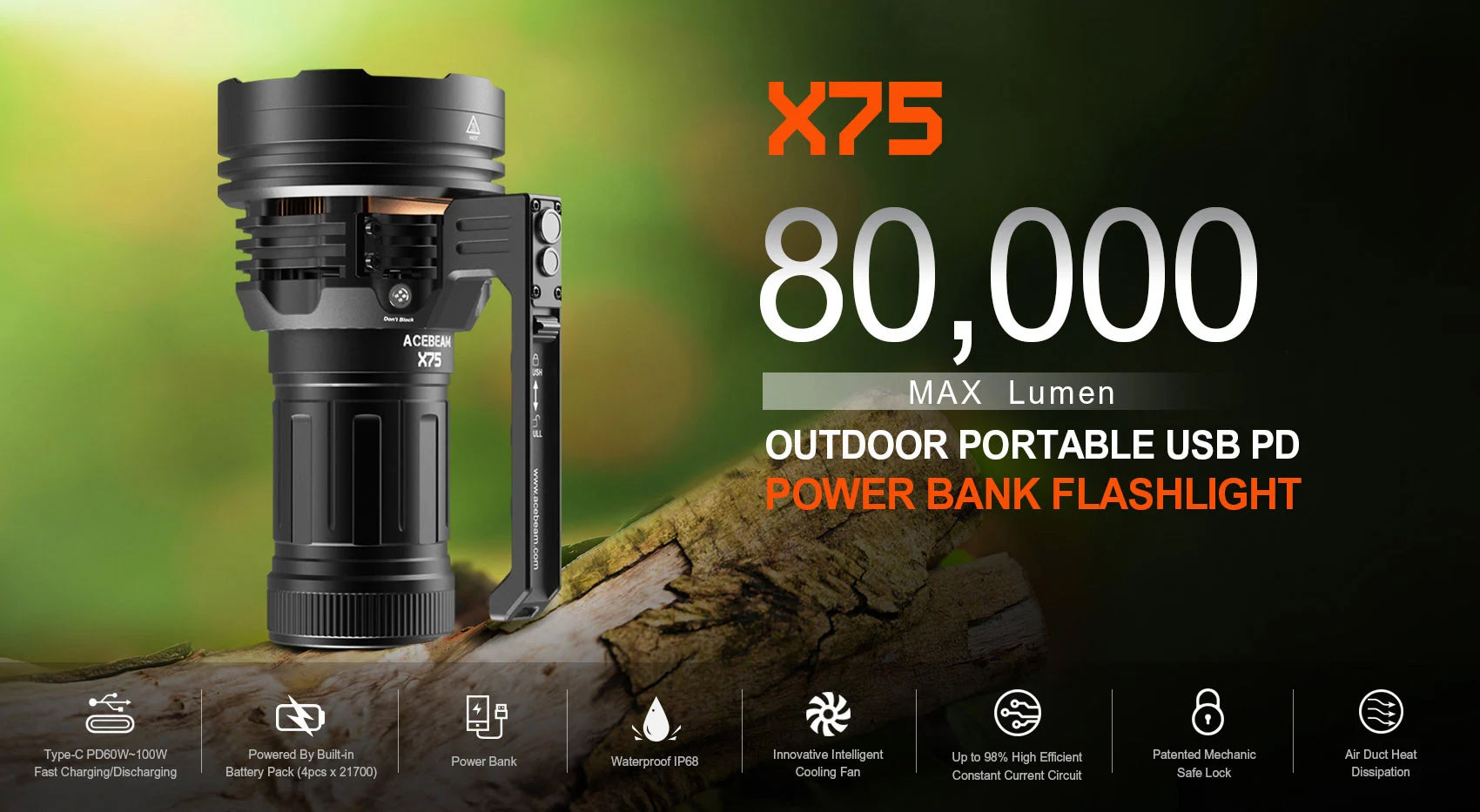Dünyanın en güçlü el fenerlerinden biri olan, Acebeam'in amiral gemisi ürünü X75 Brightest Power Bank El Feneri hayatınızı kolaylaştıran nihai bir araçtır.