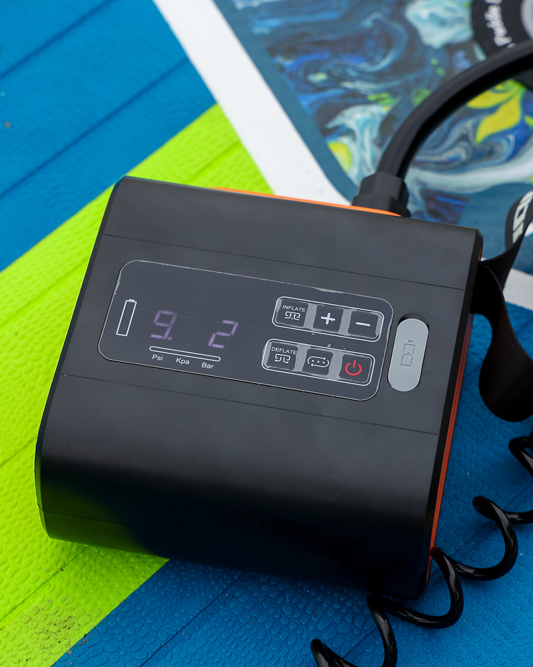 Ürün ABS gövde, ikili motor sistemi ve hızlı hava emme ile verimli ve hızlı şişirme sağlar; paddle gibi şişme ürünler için ortalama 6–7 dk şişirme süresi sunar.
