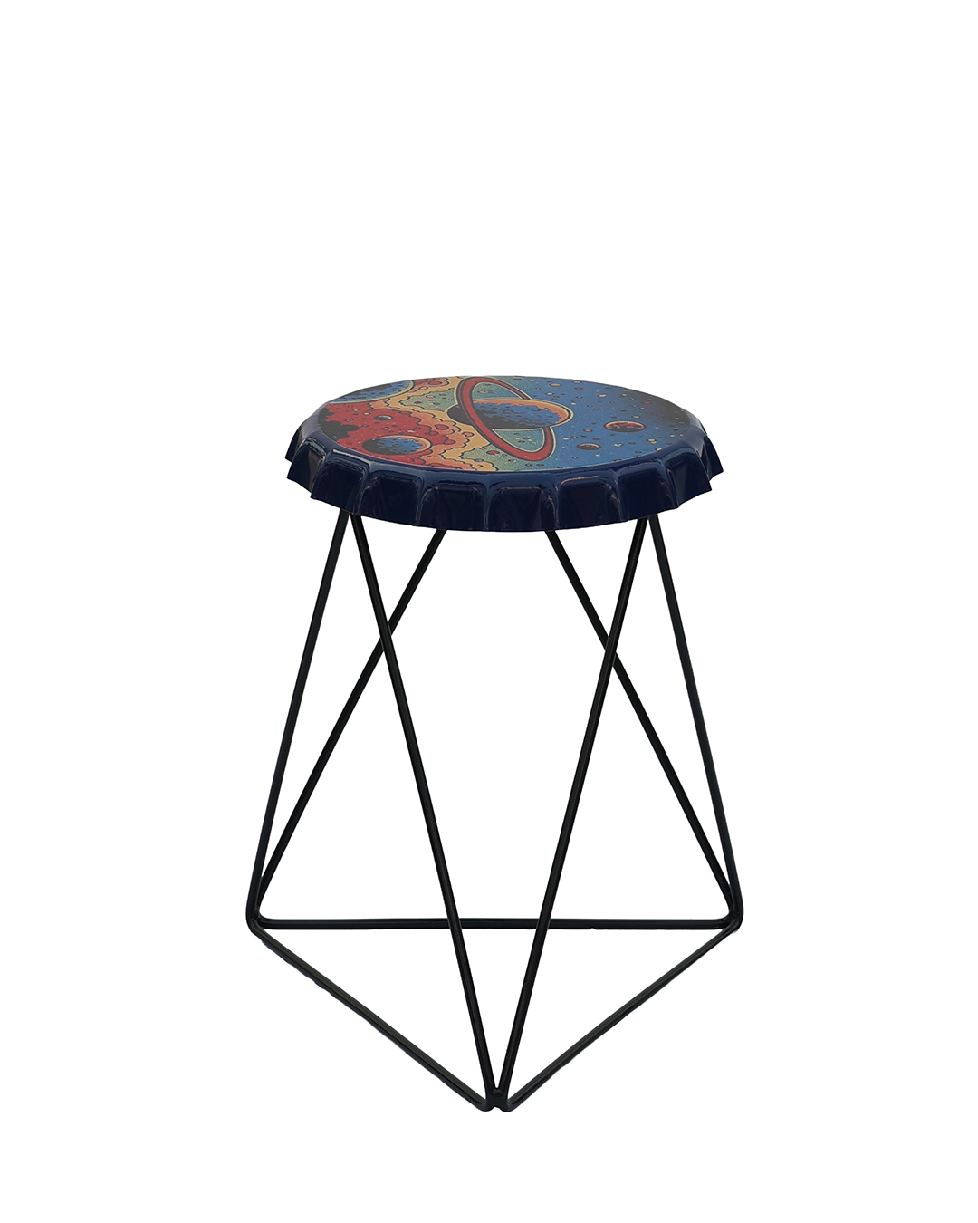 Retro bilim-kurgu estetiğini yansıtan bu metal tabure, 45 cm yüksekliği ve 34 cm oturma alanı çapı ile günlük kullanım için dengeli bir ölçü sunar. Üst yüzeyde yer alan görsel uygulama kalıcı UV baskı tekniği ile hazırlanmış olup renklerin uzun süre canlı kalması hedeflenmiştir.