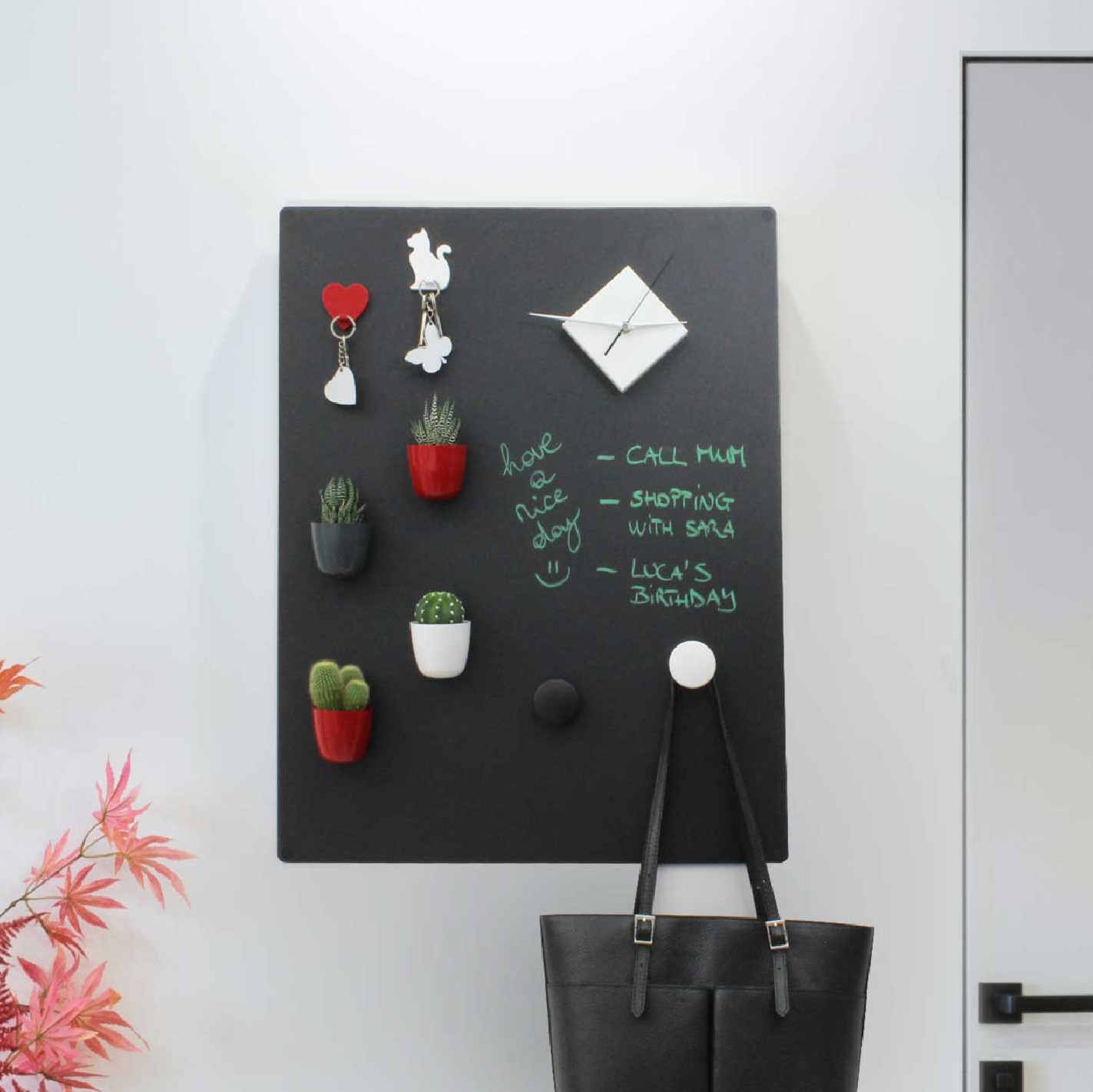 Dekoratif ve işlevsel manyetik pano tasarımına sahiptir.