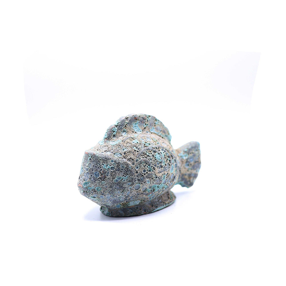 Dekoratif balık figürlü küçük heykel yaşam alanlarında görsel zenginlik sağlar ve sehpa, raf veya bahçe gibi noktalarda estetik obje olarak kullanılabilir.