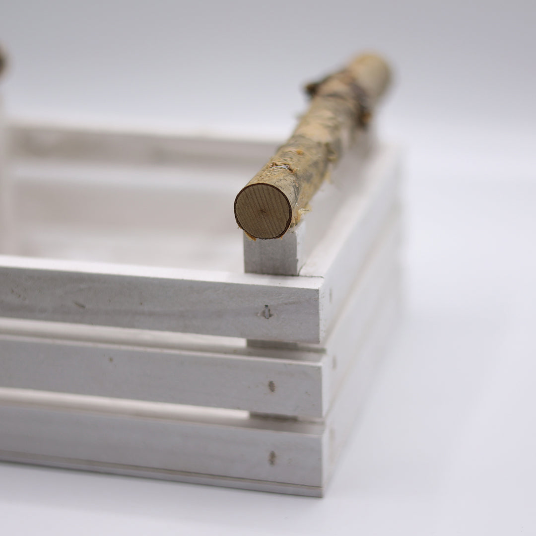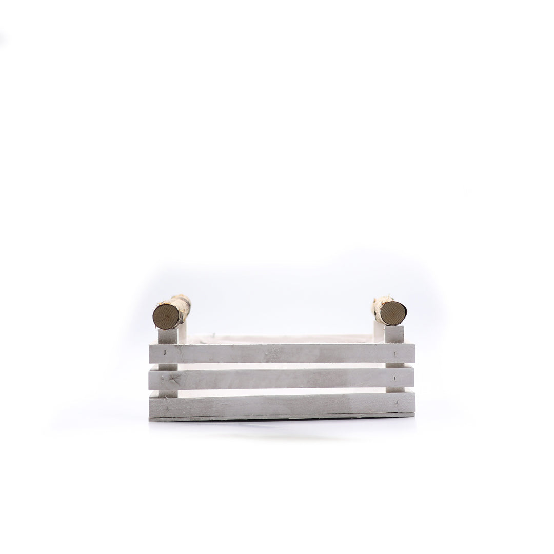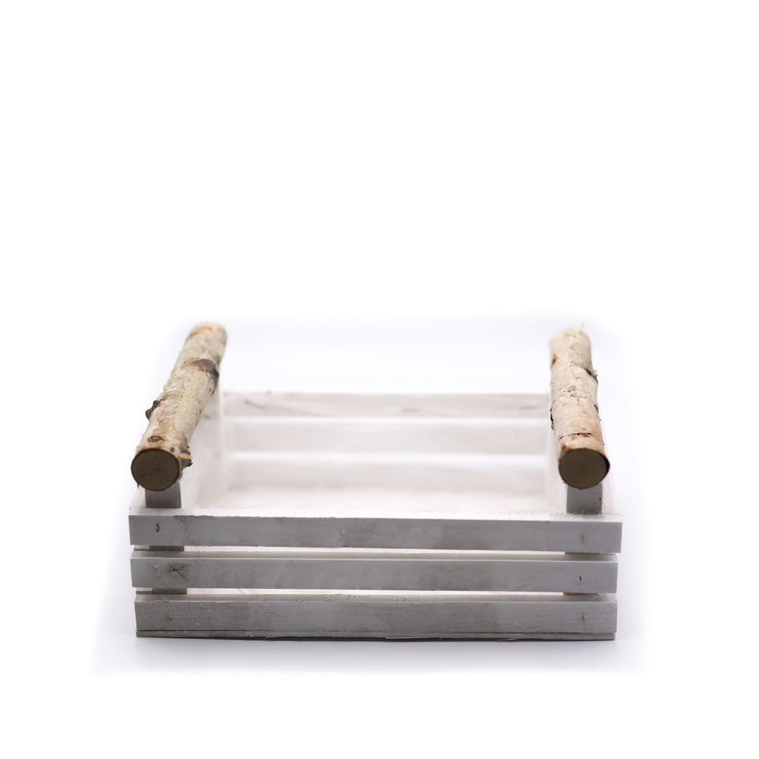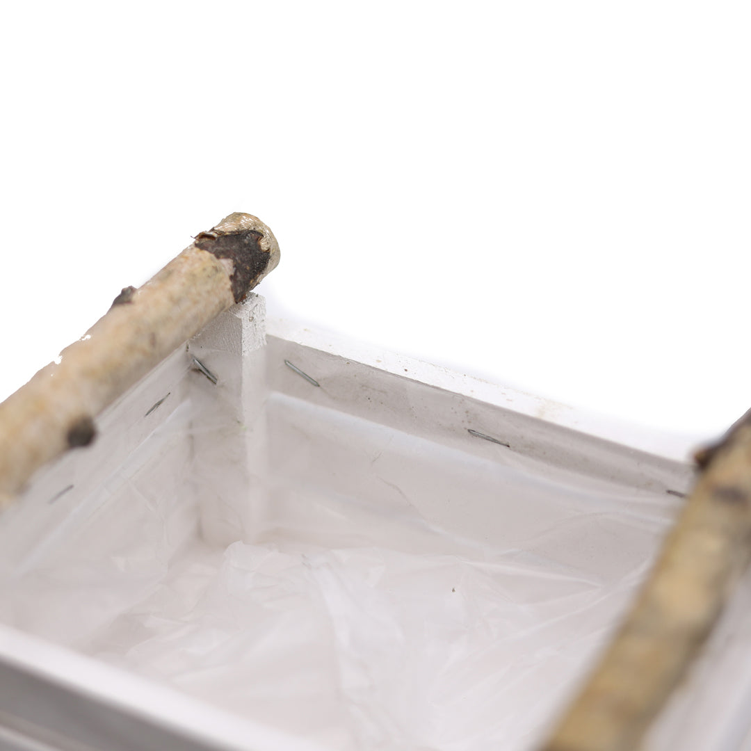 Dikdörtgen formu bitkileri yan yana düzenlemenize ve kompakt bir kompozisyon oluşturmanıza olanak tanır; beyaz renkli ahşap yüzeyi mekâna ferah bir estetik sağlar.