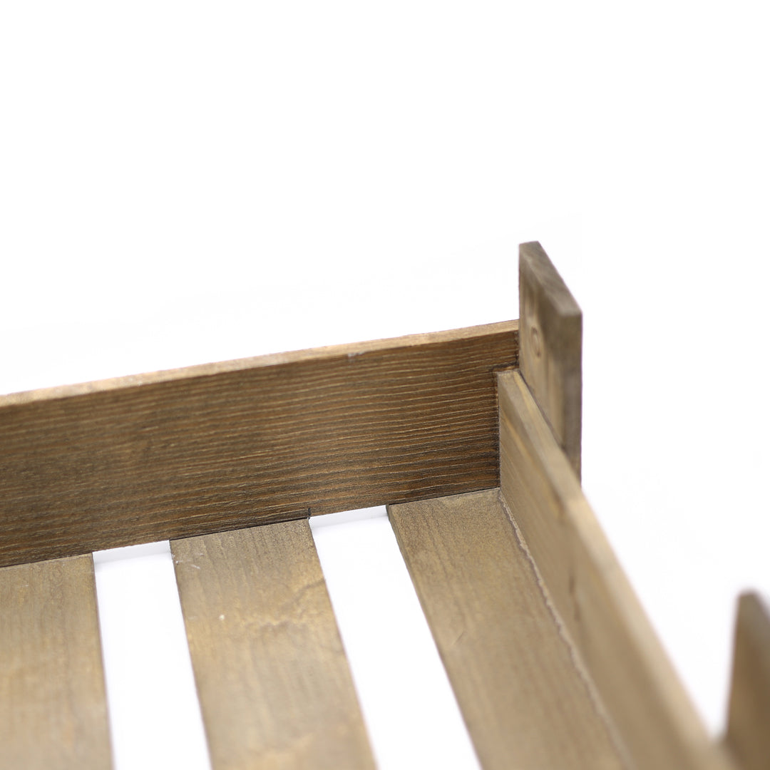 Uzun ve dikdörtgen formu, bitkileri yan yana düzenli bir şekilde konumlandırmanızı sağlar ve ahşabın dekoratif yüzeyi mekâna sıcak bir estetik sunar.