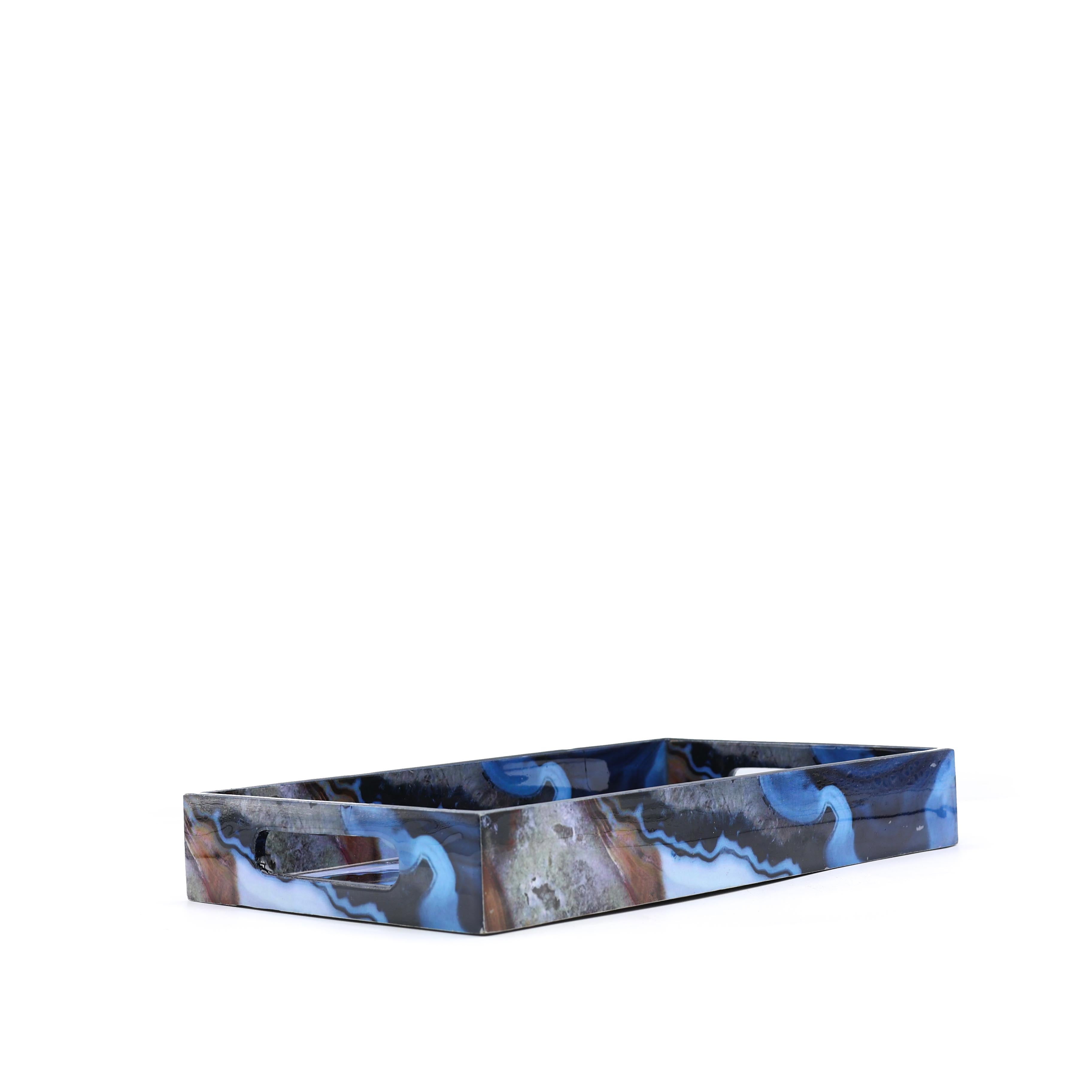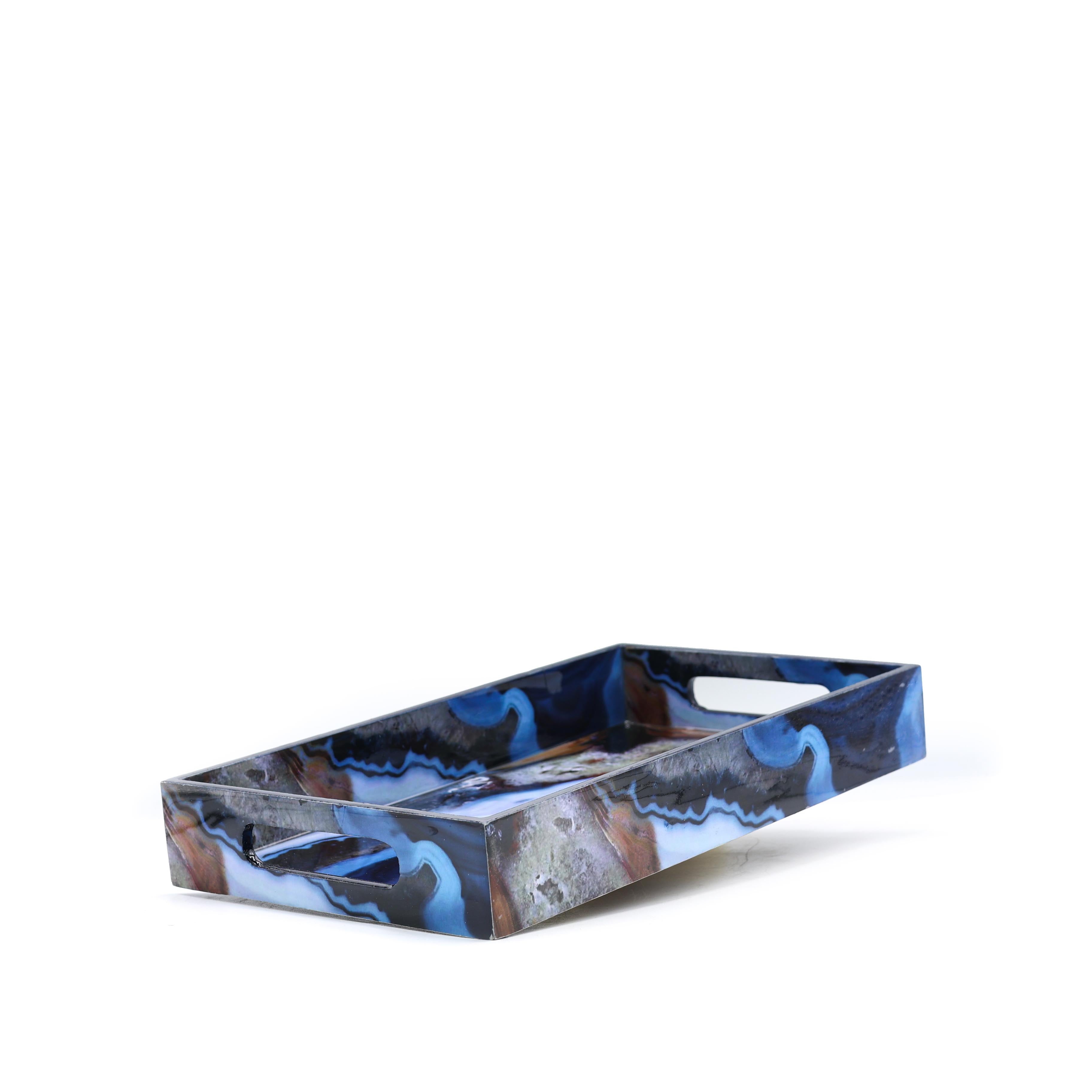 Ahşap gövde ve mavi desenli yüzeyi ile hem dekoratif obje olarak görsel zenginlik sağlar hem de servis ve sunum işlemleri için pratik bir yüzey sunar.
