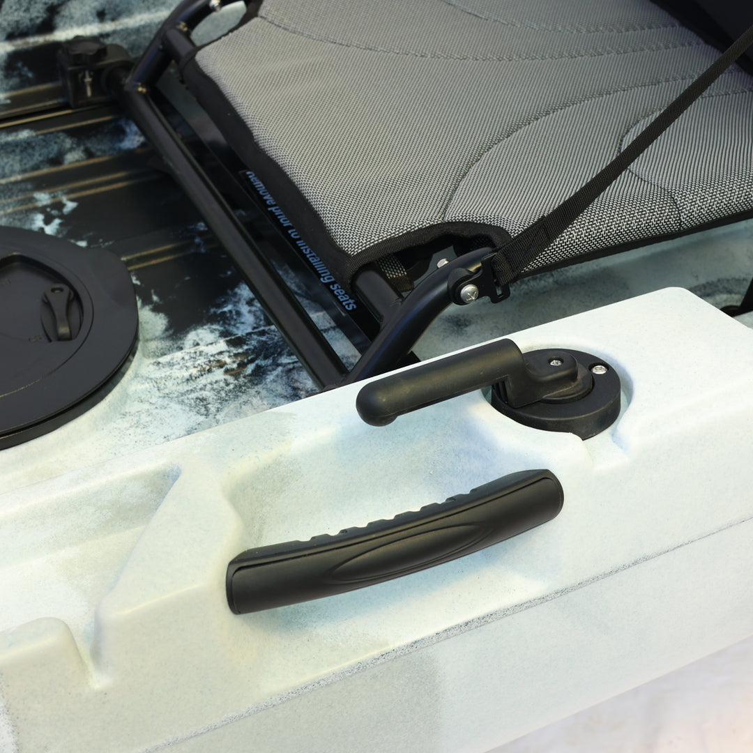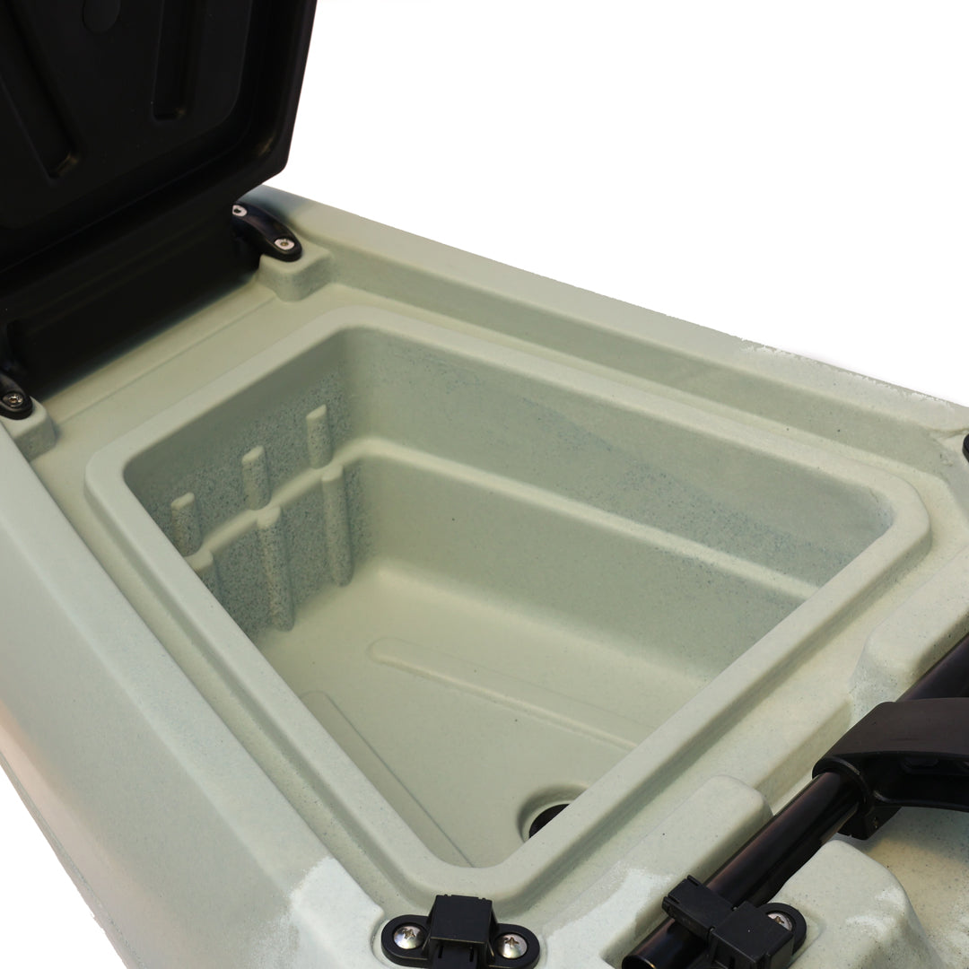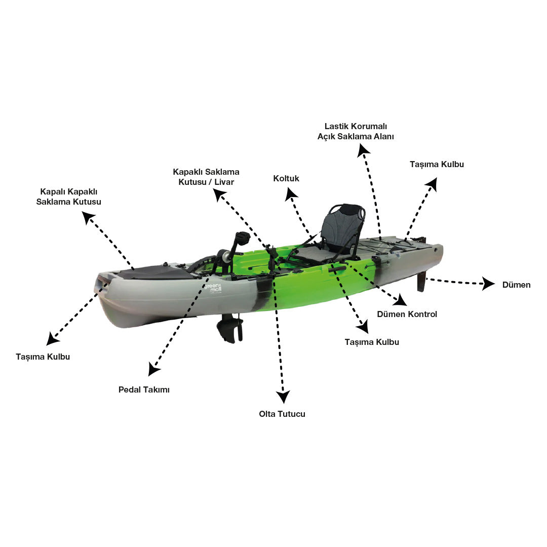 Kompakt gövde ölçüleri ve pedal sistemi ile tasarlanan bu model, tek kişilik kullanımda kontrollü ve pratik bir sürüş deneyimi sunmayı hedefler. Ön bölümde bulunan kapaklı saklama kutusu ve arka kısımda yer alan lastik korumalı açık saklama alanı, balıkçılık ekipmanlarının ve diğer malzemelerin düzenli şekilde taşınmasına yardımcı olur. Ayrıca 4 adet montaj yuvası, farklı aksesuarların yerleştirilmesi için esnek kullanım seçenekleri sunar.