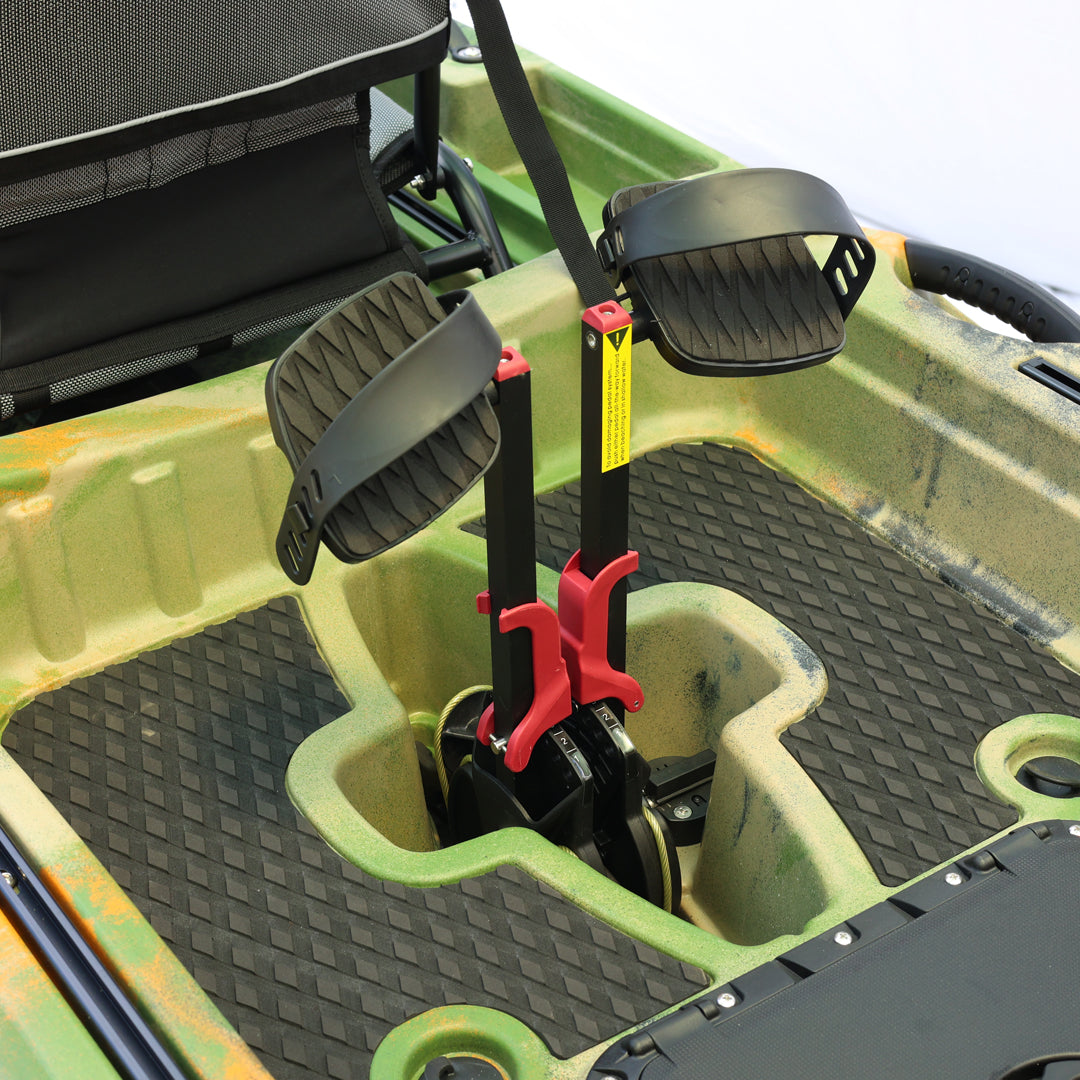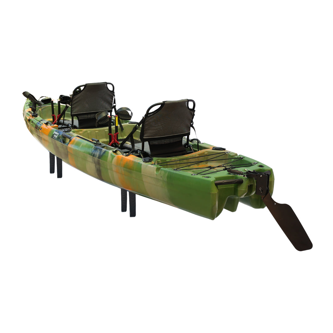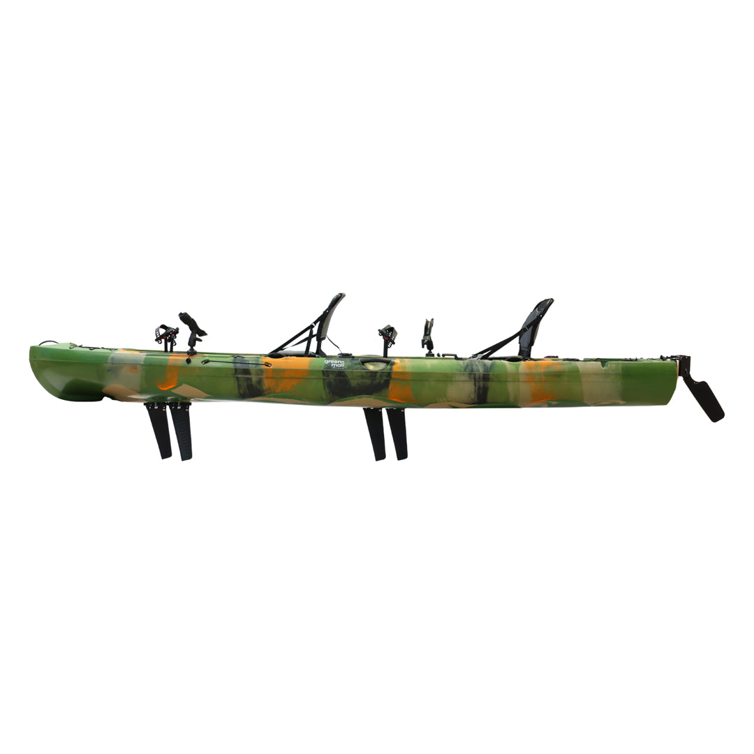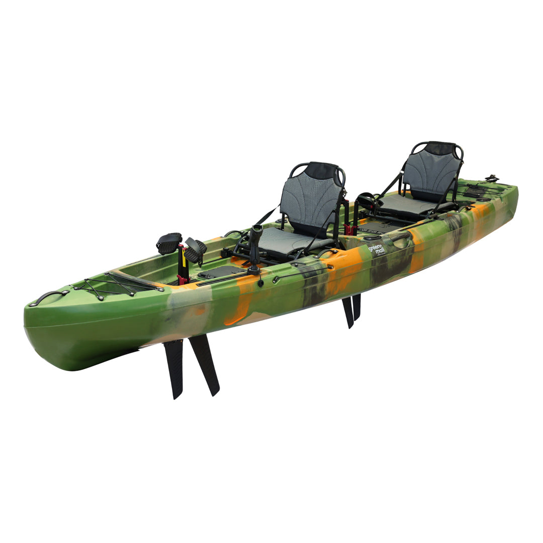 İki kişilik kullanım için tasarlanan bu model, çift pedal sistemi ve çift kürek yapısı sayesinde iki kullanıcıyla eş zamanlı sürüş ve manevra imkânı sunar. Ön bölümde yer alan kapaklı saklama kutusu ve arka tarafta bulunan lastik korumalı açık saklama alanı, balıkçılık ekipmanlarının düzenli ve erişilebilir şekilde taşınmasına yardımcı olur. Ayrıca 2 adet livar ve 4 adet montaj yuvası, aksesuar ve ekipman yerleşimini daha esnek biçimde planlamaya olanak tanır.