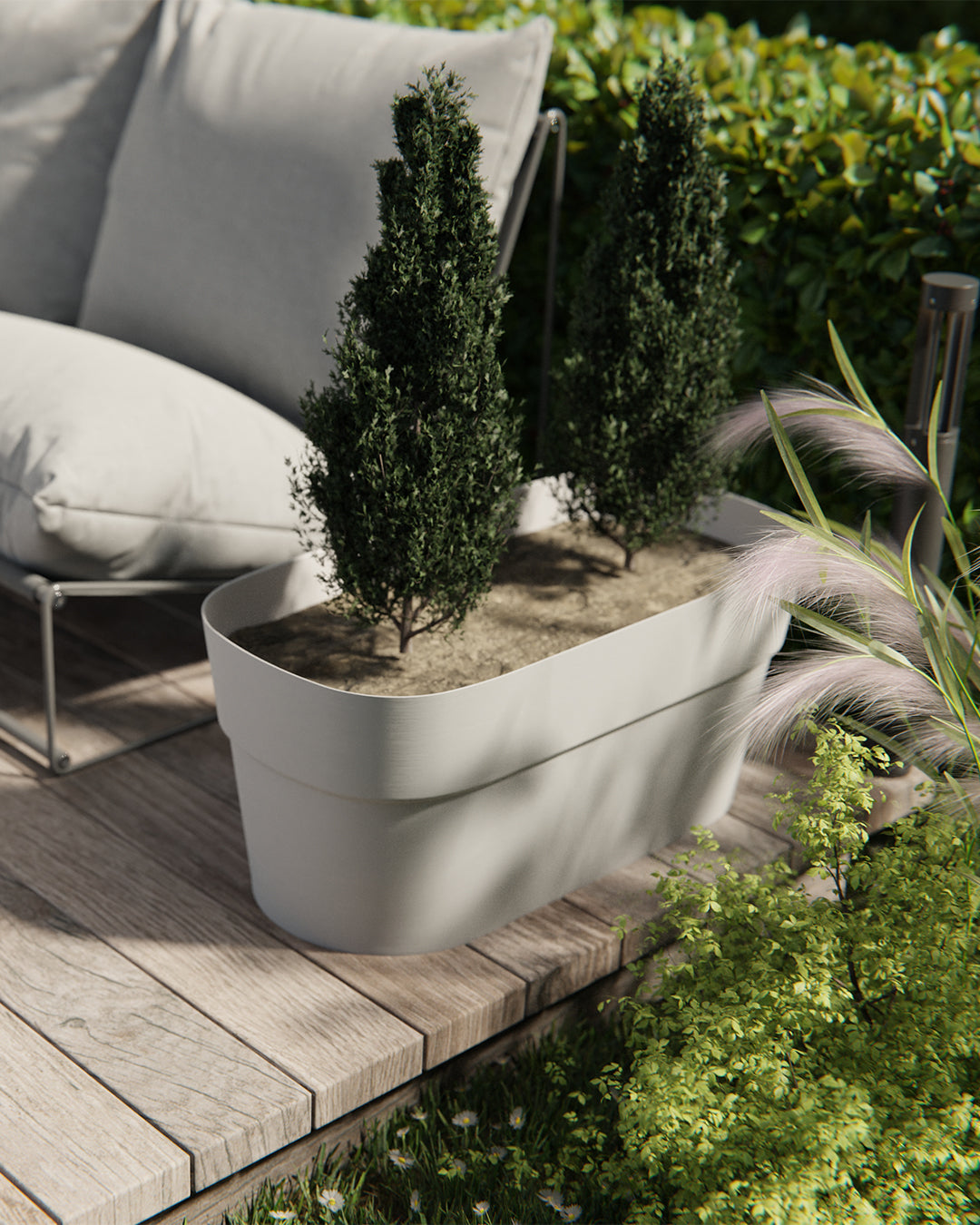 Saksı ölçüleri 78 x 38 cm ve 35 cm yükseklik şeklindedir. 103 litre hacmi sayesinde birden fazla bitki yerleşimine imkân tanırken mekânda geniş, modern ve dengeli bir görünüm oluşturur.