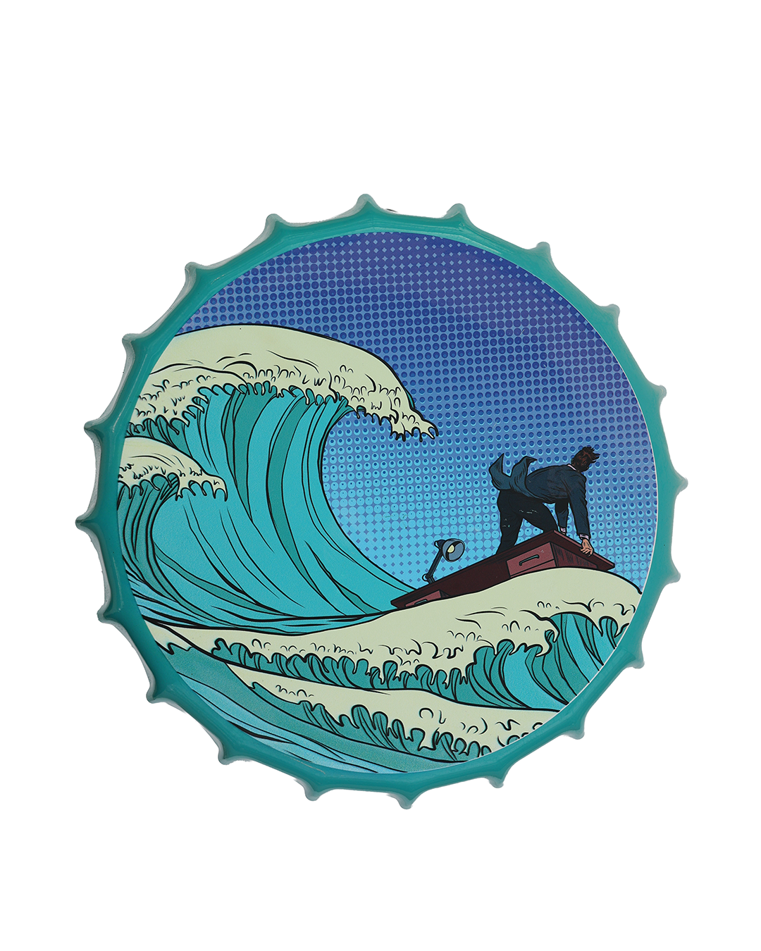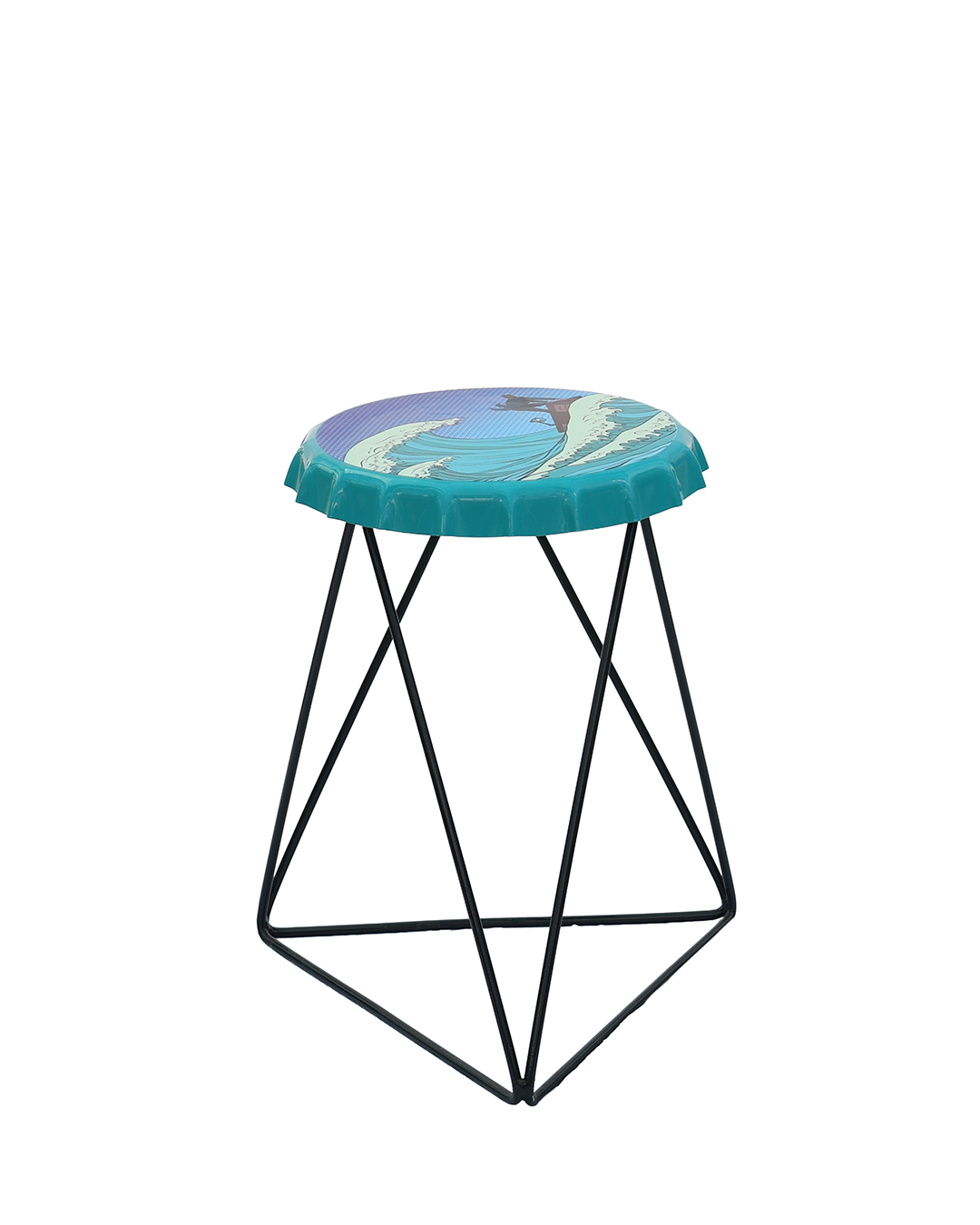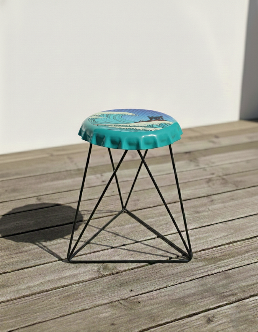 Deniz dalgalarından ilham alan retro illüstrasyon diliyle tasarlanan bu metal tabure, 45 cm yüksekliği ve 34 cm oturma alanı çapı ile günlük kullanım için dengeli bir ölçü sunar. Üst yüzeyde yer alan görsel uygulama kalıcı UV baskı tekniği ile hazırlanmış olup renklerin uzun süre canlılığını koruması hedeflenmiştir.