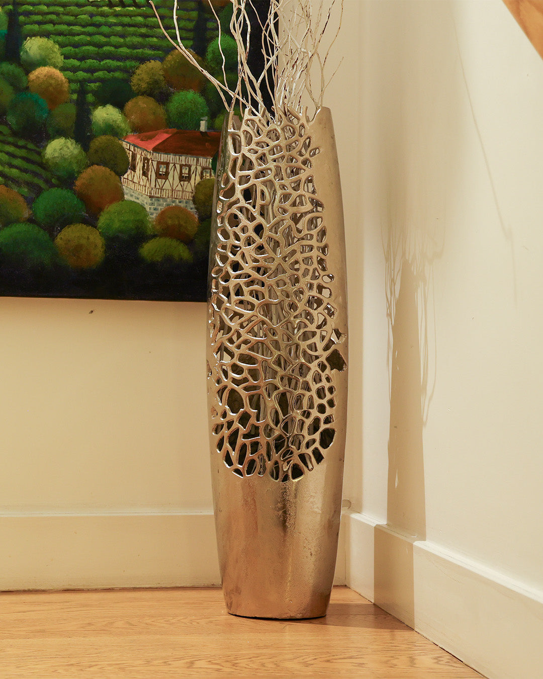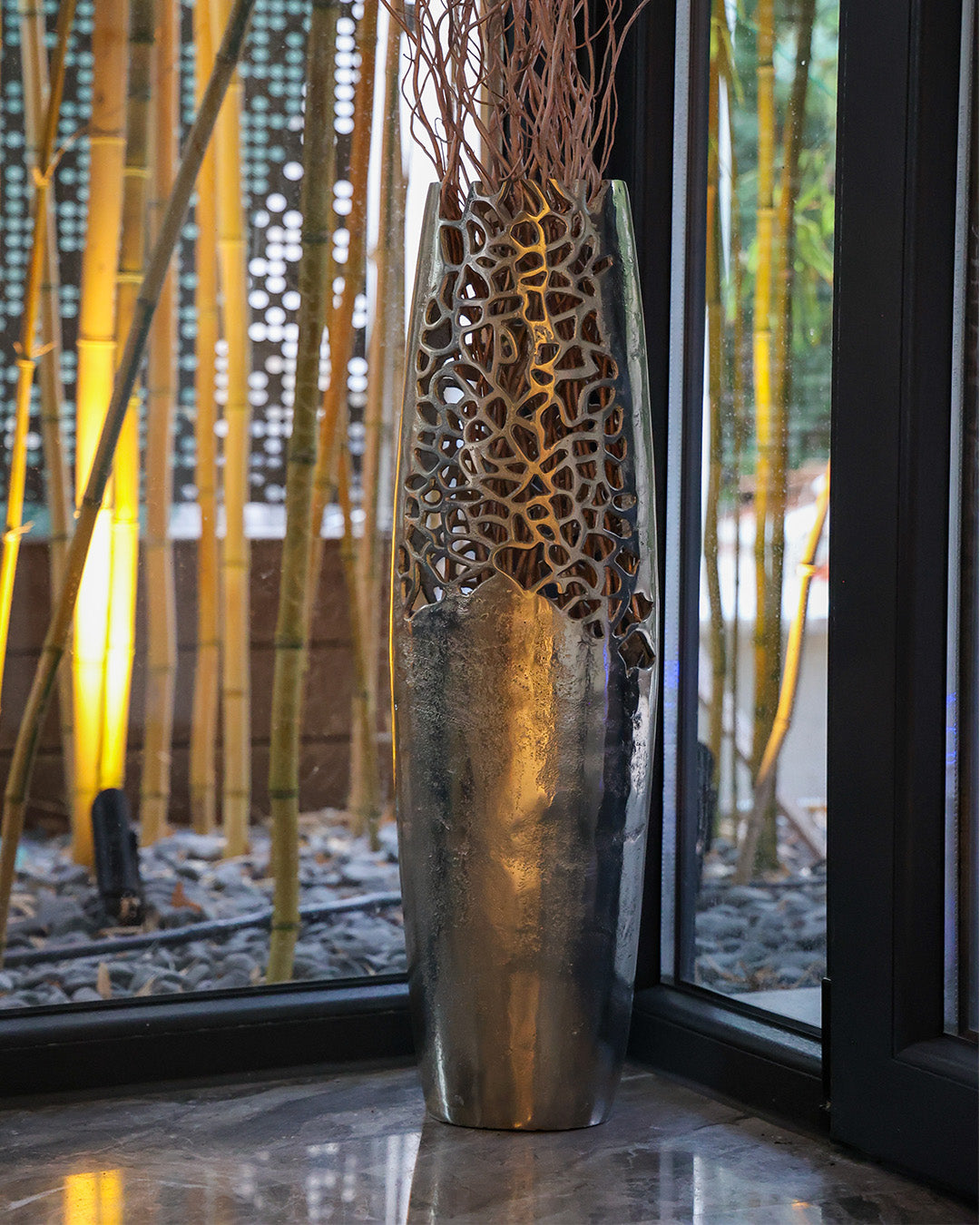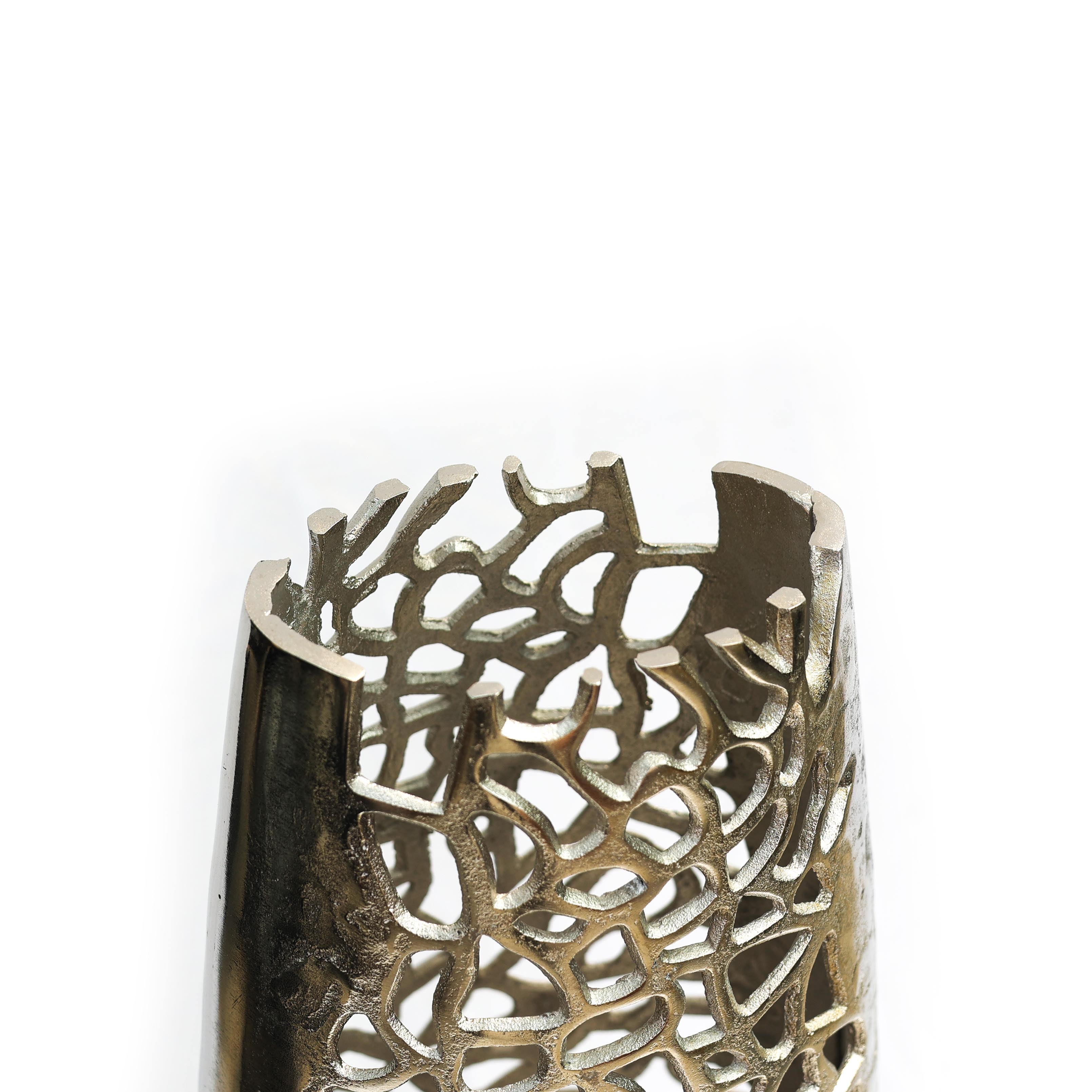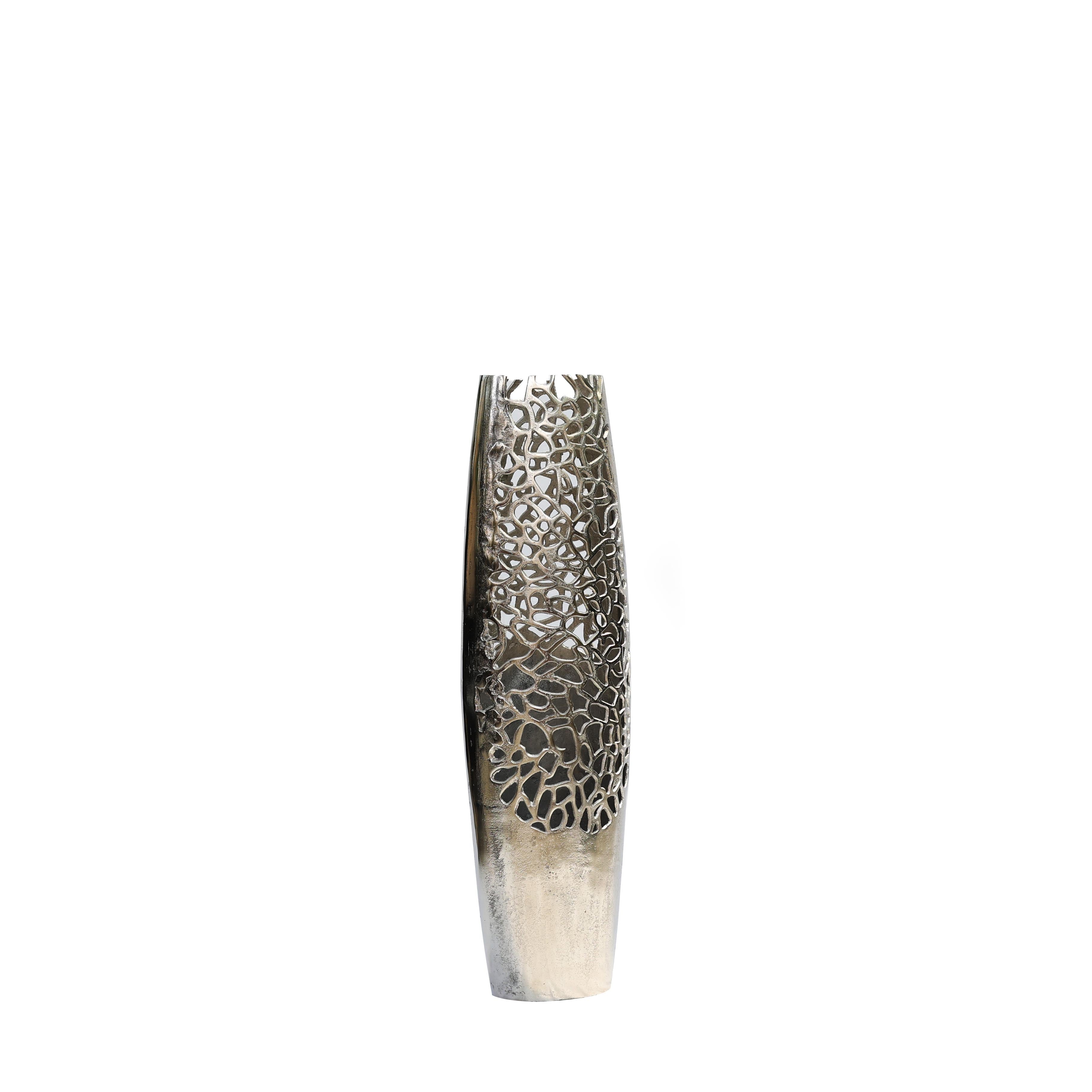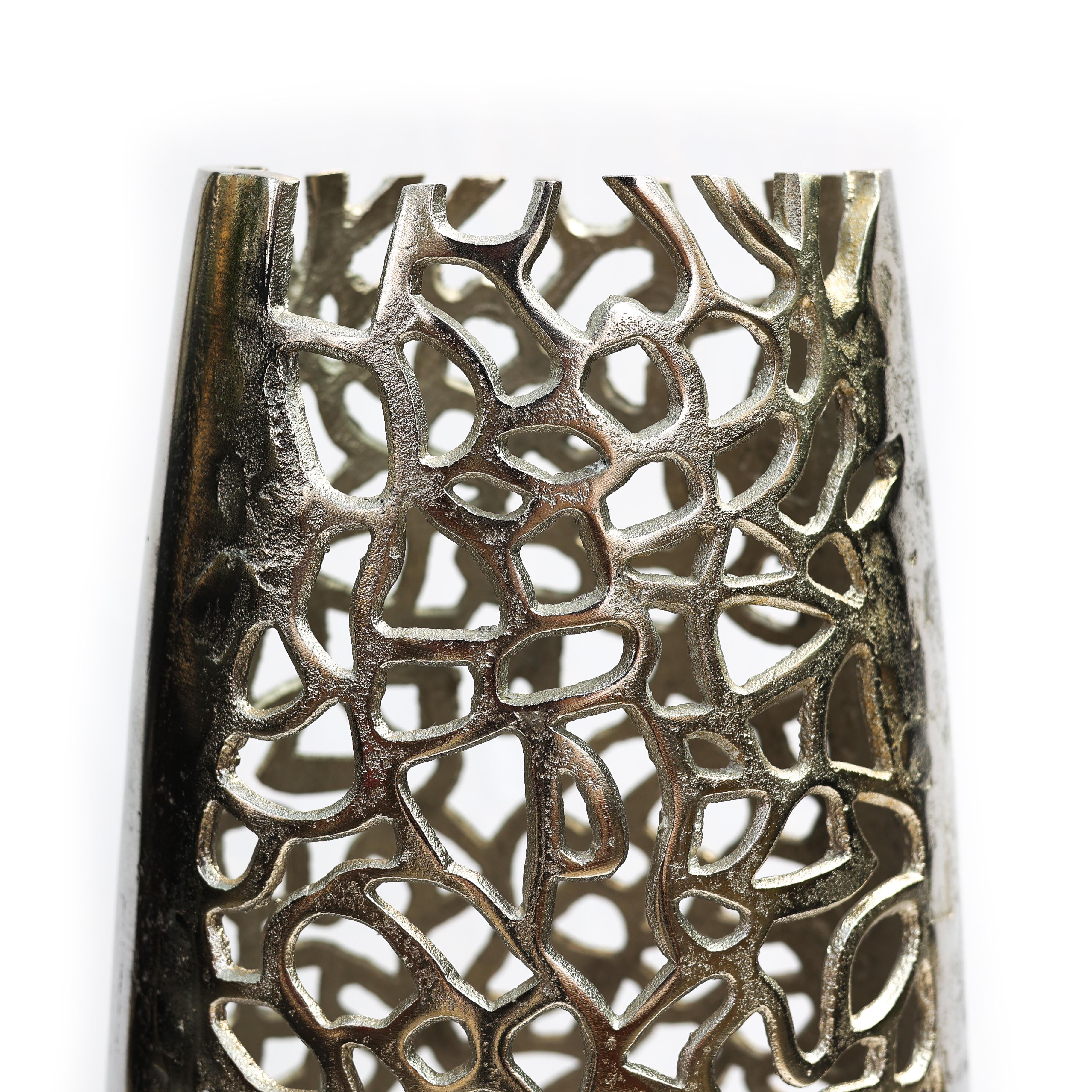 Parlak gümüş yüzeyi, çağdaş ve modern dekorasyon anlayışıyla uyum sağlayarak bulunduğu mekâna şık ve dengeli bir görünüm kazandırır. Geometrik desen detayları ise yüzeye el işçiliğini andıran hareketli bir doku kazandırarak dekoratif etkiyi güçlendirir.