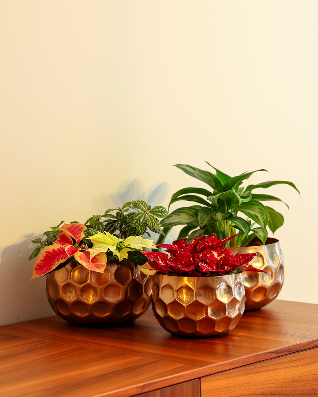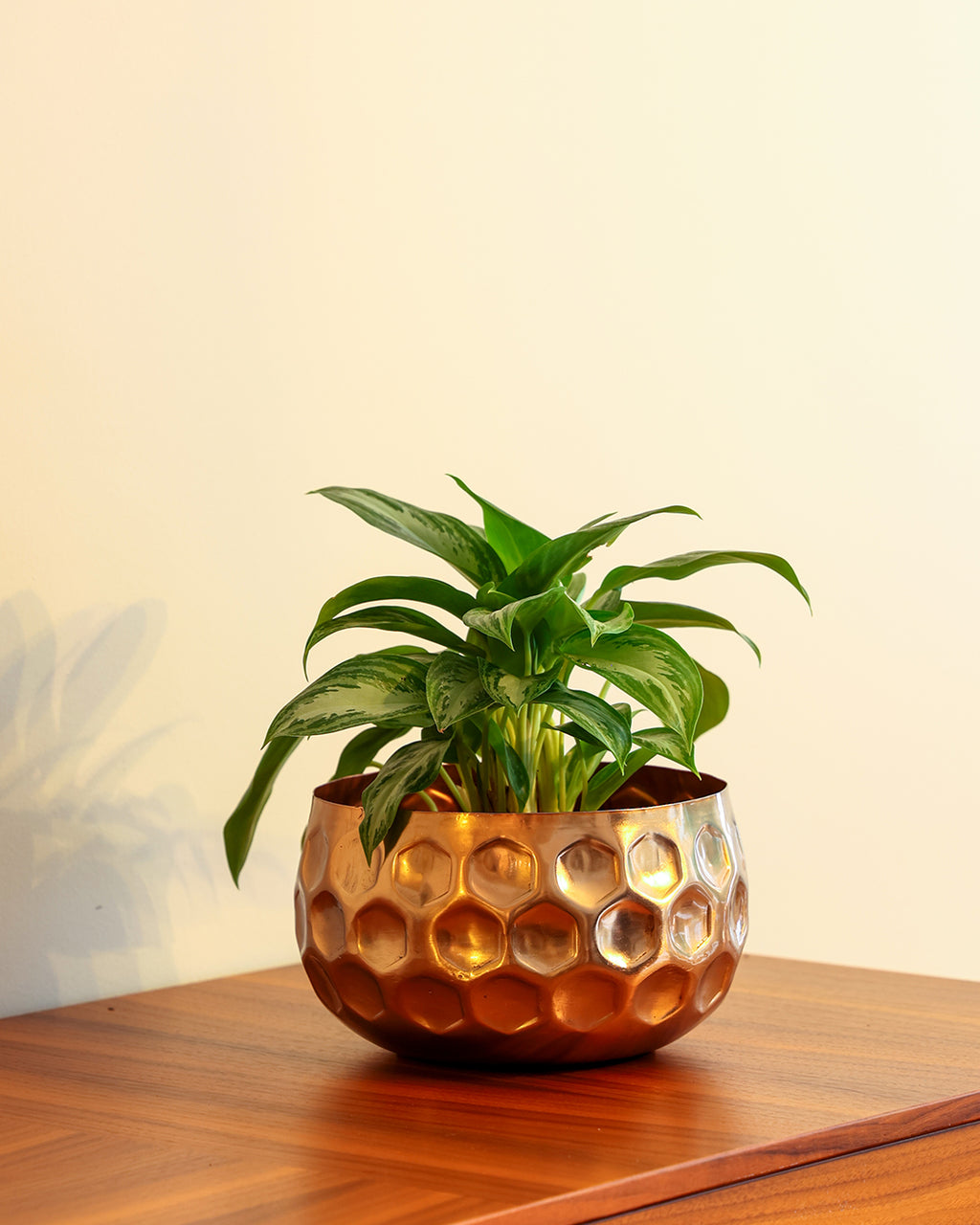 Parlak metal yüzeyiyle yeşil dokuların doğal görünümünü vurgular, dekorasyona şık bir dokunuş katar.