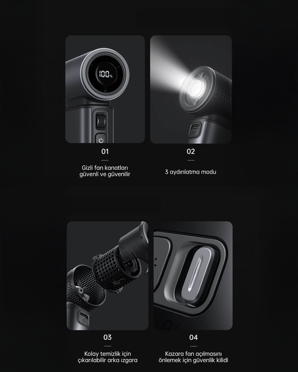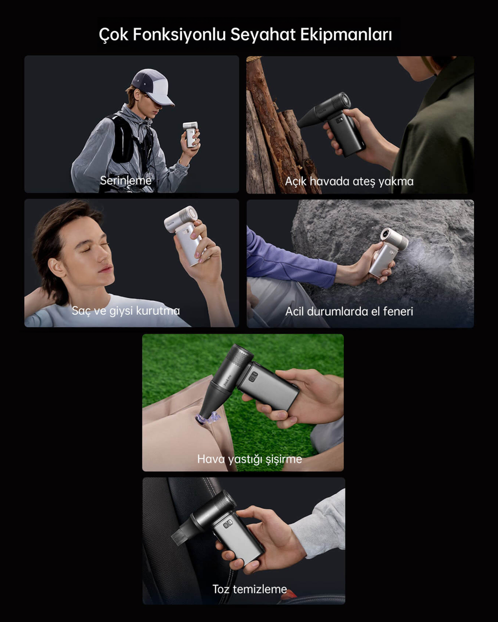 • Çok fonksiyonlu yapısı ile serinletme, ateş yakma, kurutma, şişirme ve toz temizleme gibi çok amaçlı kullanım sağlar.