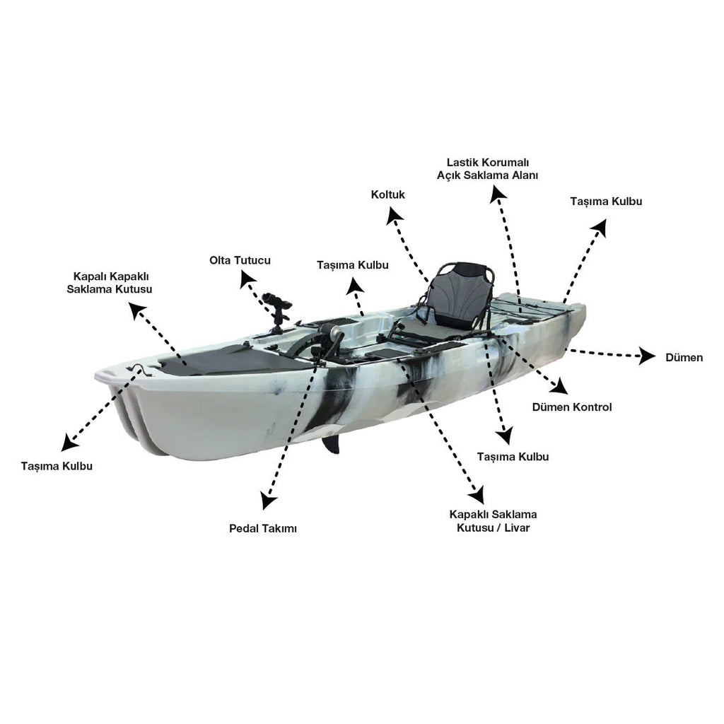 Pedallı sürüş sistemi, elleriniz boşken manevra yapmanızı sağlar; hem dengeyi korur hem de sessiz ilerleme imkânı sunar. Livarı, yem ile balık çekme deneyimini mümkün kılar. Kapaklı ön gövde, arka lastikli saklama alanı ve 6 montaj yuvası, profesyonel kullanım ekipmanlarını düzenli şekilde taşımanızı sağlar. Elektrikli motor veya balık bulucu gibi cihazlarla kolay entegre edilebilir altyapıya sahiptir. CE sertifikası ile güvenli kullanım garantisi sunar.
