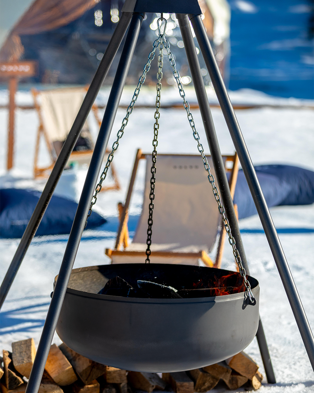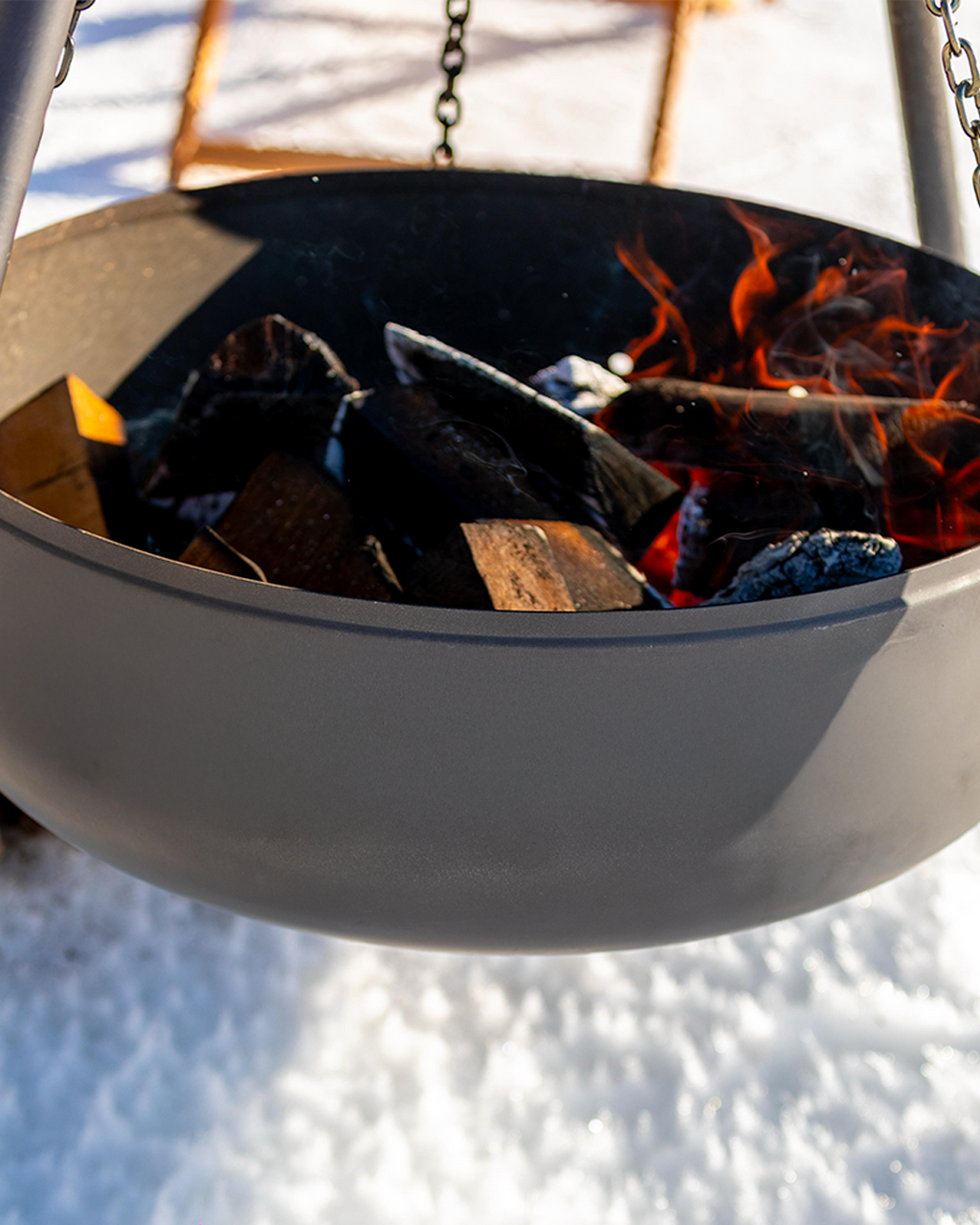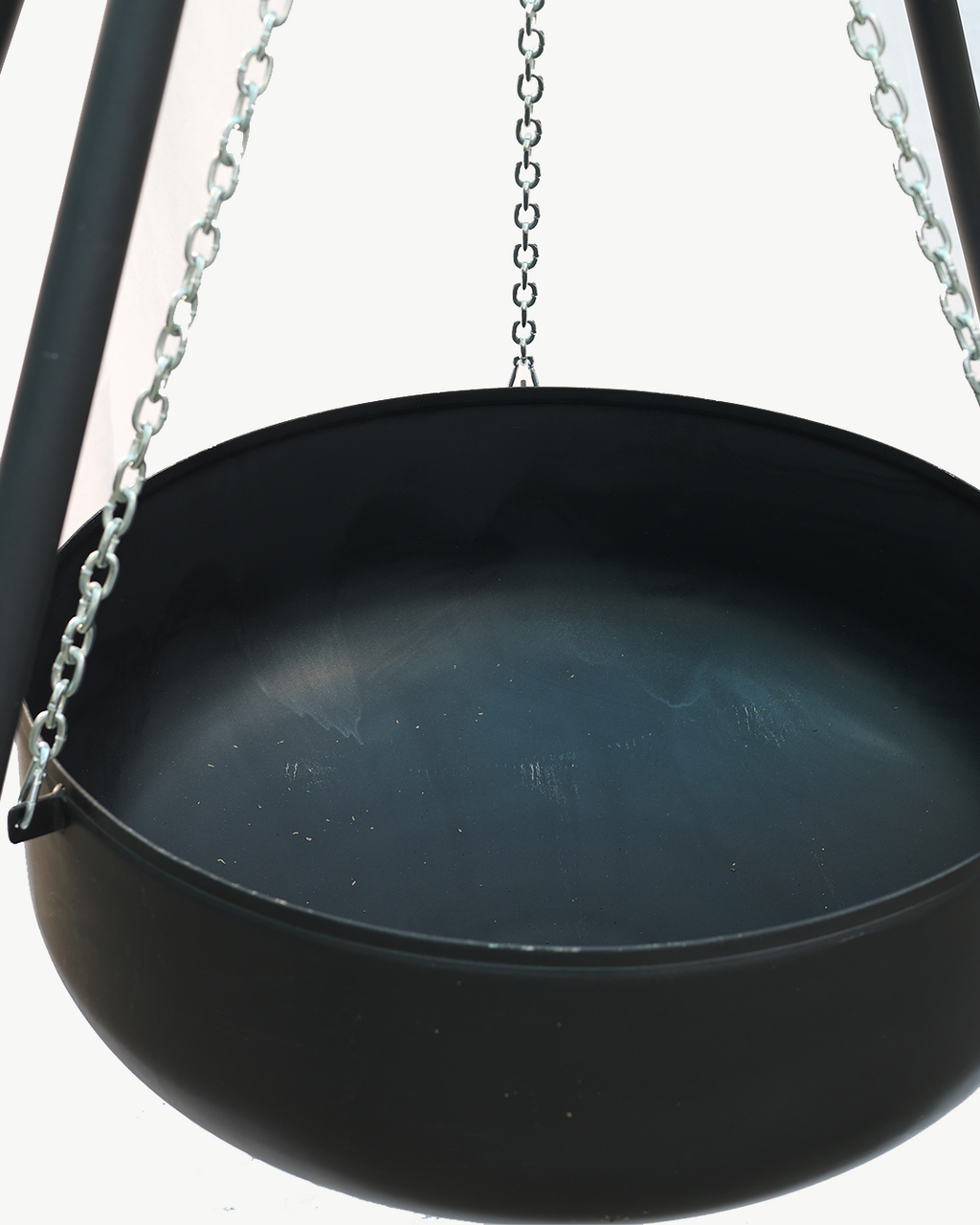 Nomad Askılı Ateş Çukuru, üç ayaklı tripod yapısı ve zincir askılı kazan tasarımıyla dış mekânlarda hem ateş keyfi hem de pişirme için güçlü bir çözümdür.