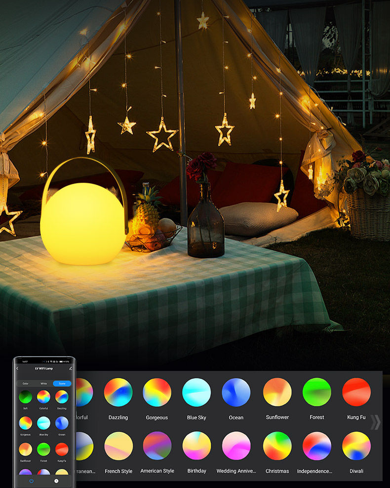 16 farklı ışık rengi, 4 ışık modu ve 6 kademeli parlaklık ayarı, ışığı ortama ve ihtiyaca göre ayarlamayı kolaylaştırır. IR uzaktan kumanda ile tüm ayarlar pratik şekilde kontrol edilebilir; ayrıca alt kısımdaki aç/kapa ve renk modu tuşu ile manuel kullanım da mümkündür. USB-C şarj sistemi ve 1500 mAh dahili bataryası sayesinde 7–15 saat kablosuz kullanım imkânı sunar.