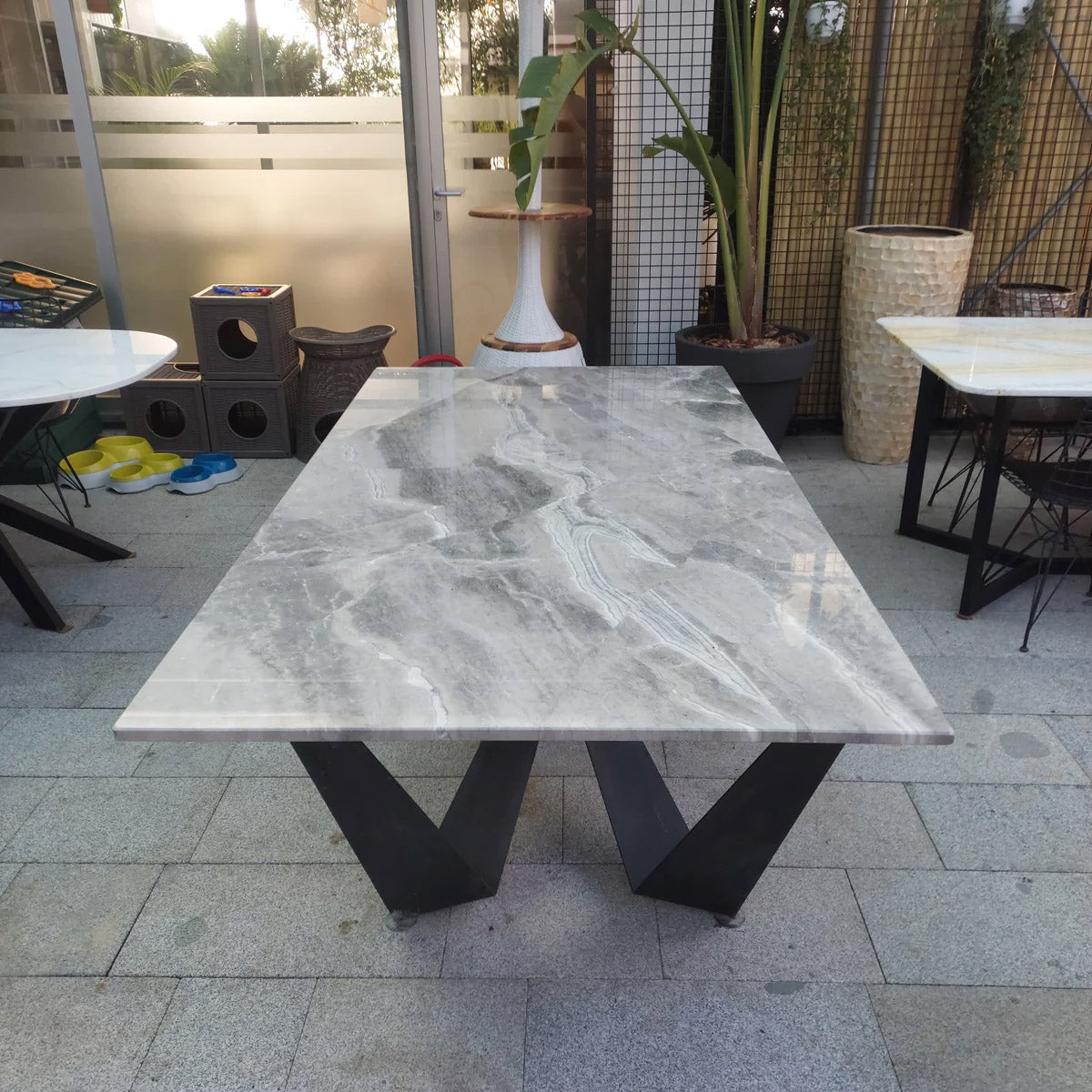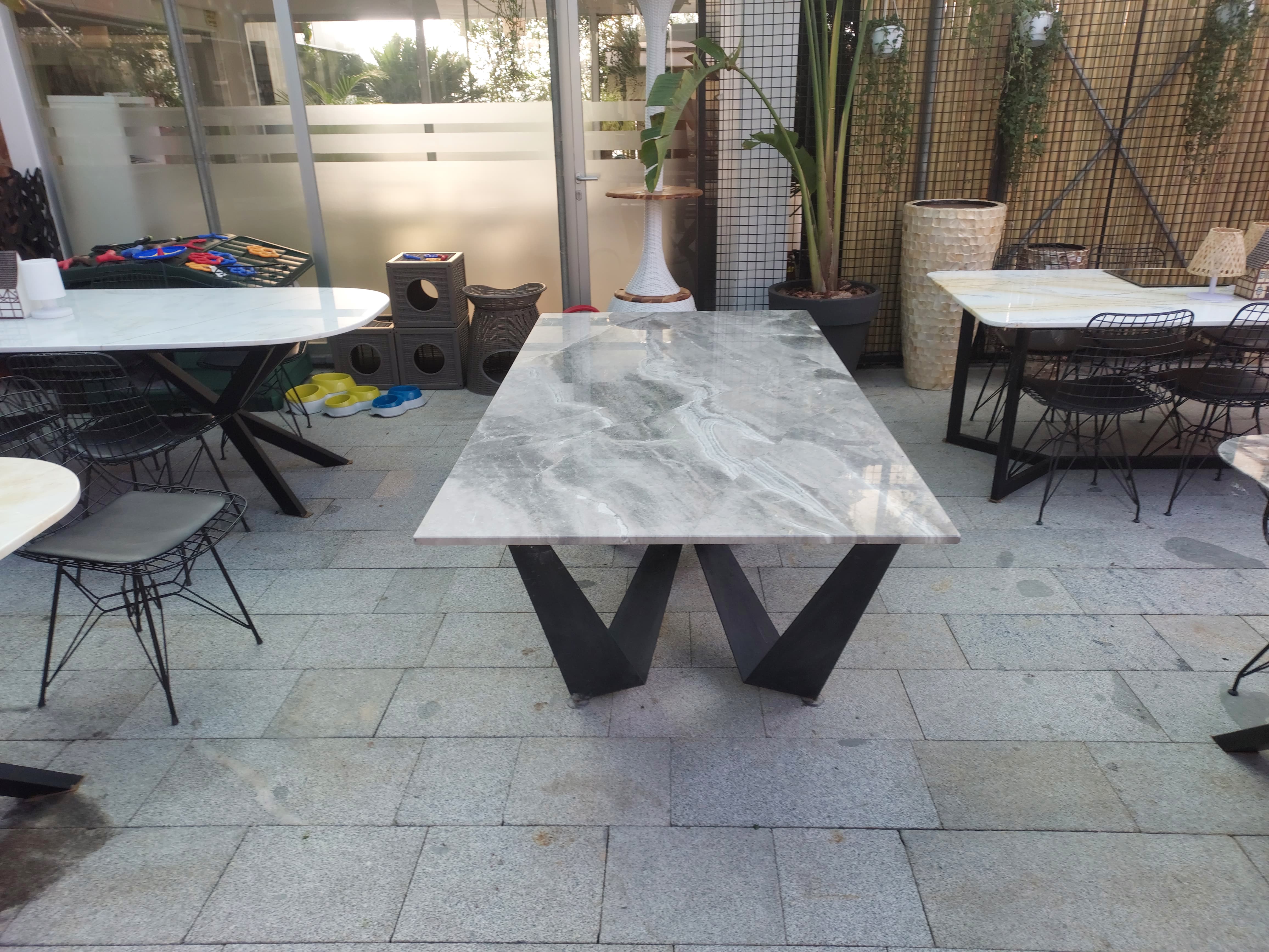 Doğal mermer dokusu, sade tasarımıyla birlikte modern ve klasik dekorasyon stilleriyle kolayca uyum sağlar. Yemek alanları, toplantı odaları ve geniş salon düzenlemelerinde hem işlevsel hem de dekoratif bir masa yüzeyi olarak tercih edilebilir.