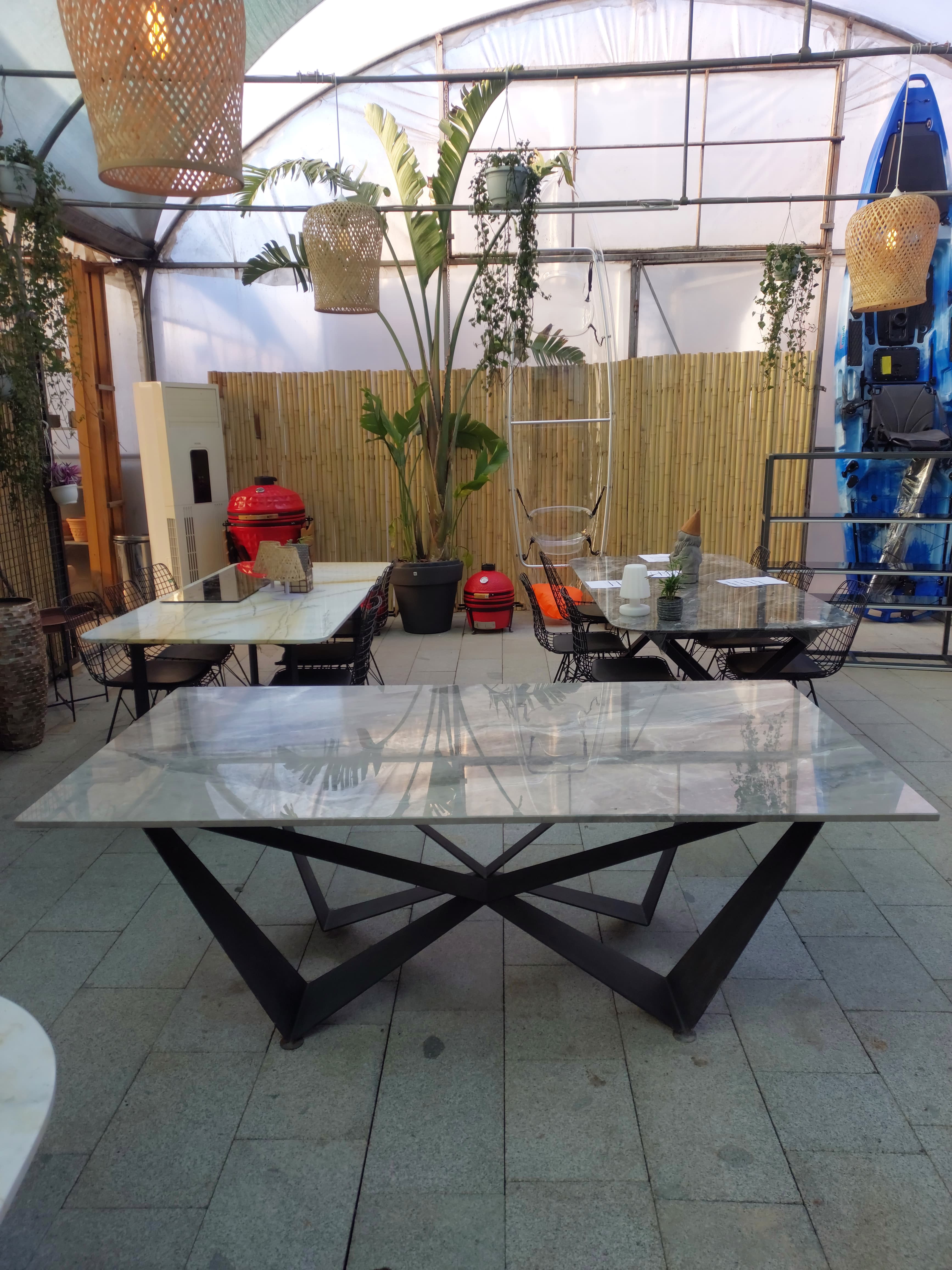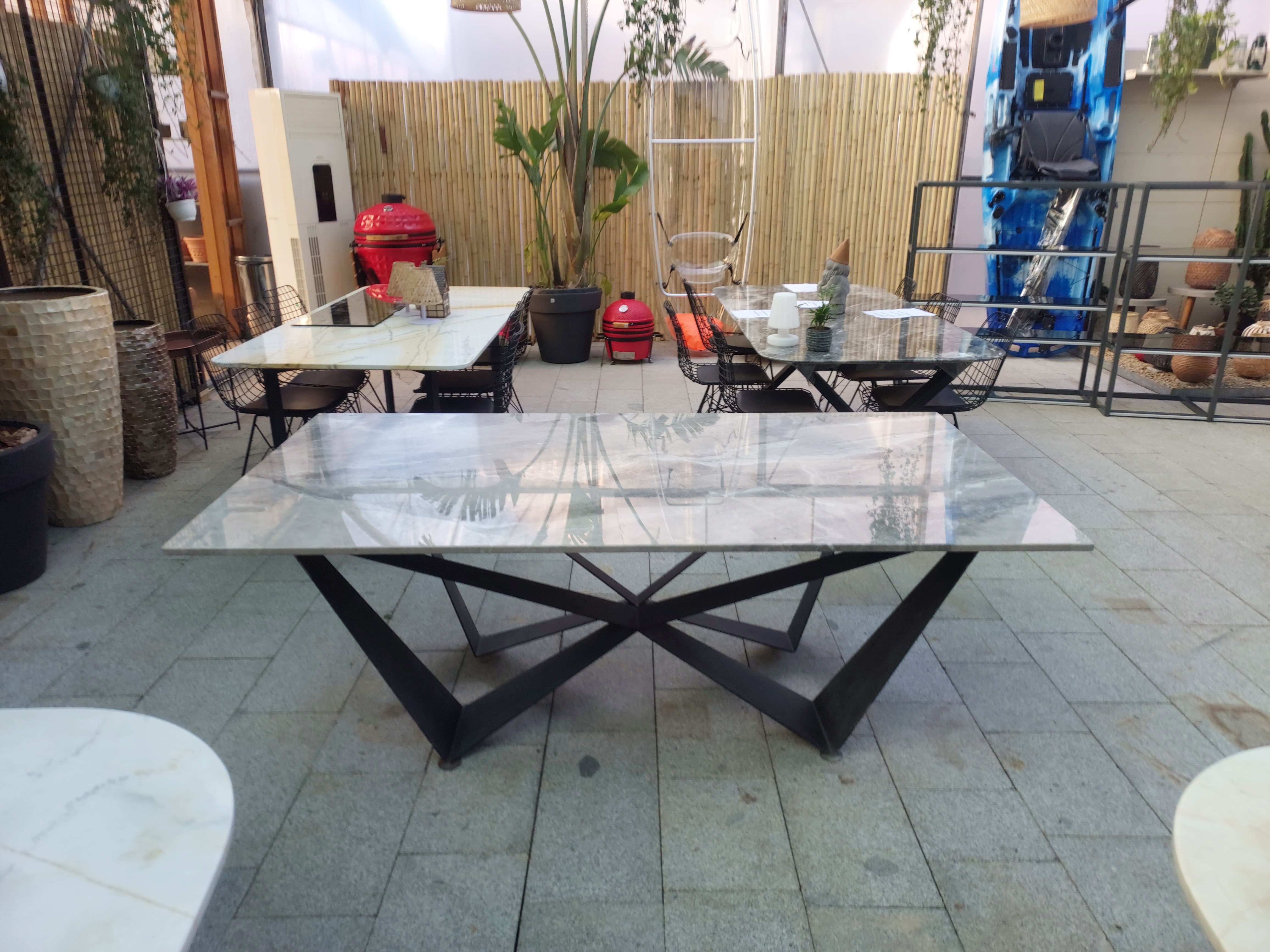 200 × 105 cm ölçülerine sahip geniş yüzeyi, birden fazla kişinin aynı anda rahat şekilde kullanabileceği ferah bir alan sunar. 2 cm kalınlığındaki mermer tabla, sağlam yapısıyla masaya dengeli bir duruş kazandırırken mekânda güçlü ve zamansız bir görünüm oluşturur.