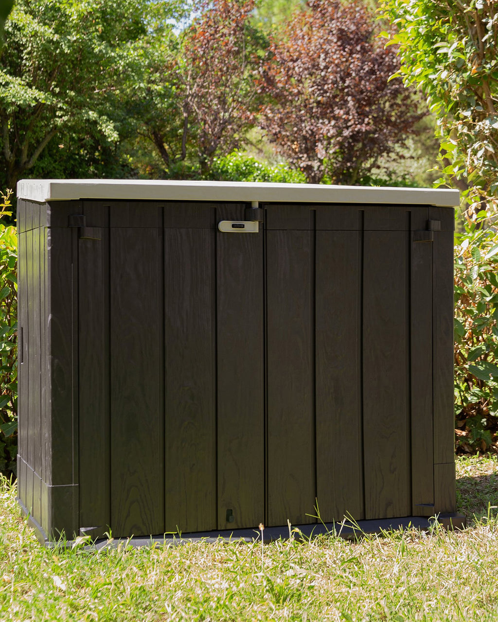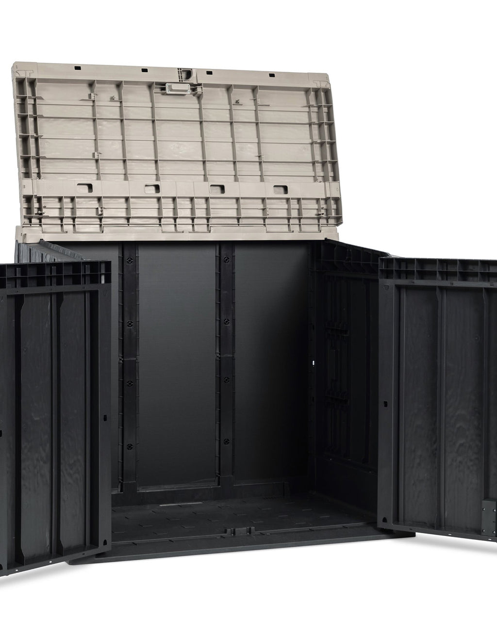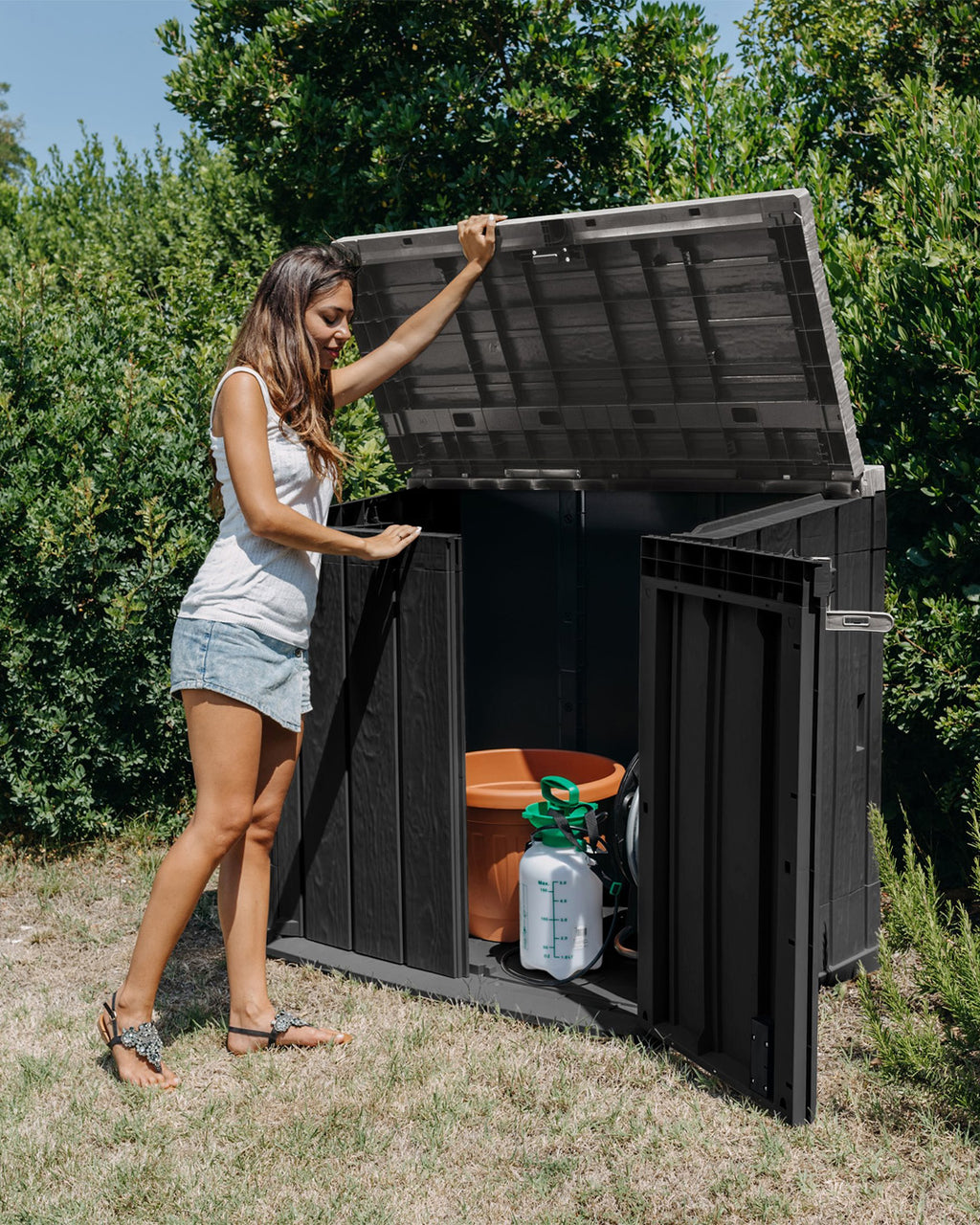 Geniş iç hacmi ve dikey formu sayesinde iç ve dış mekânlarda düzenli bir depolama alanı sunar. 129,5 cm en, 74,5 cm derinlik ve 111 cm yükseklik ölçüleri; bahçe, balkon, teras ve depo alanlarında büyük hacimli eşyaların muhafazası için ideal bir kullanım sağlar. 842 litrelik kapasitesi ile bahçe ekipmanları, dış mekân aksesuarları ve çeşitli depolama ihtiyaçlarına pratik bir çözüm sunar.