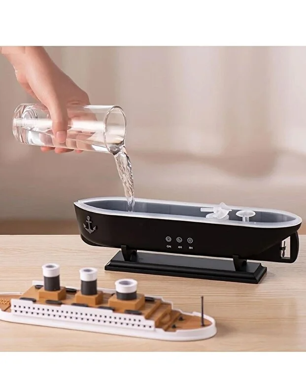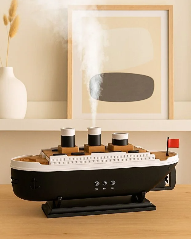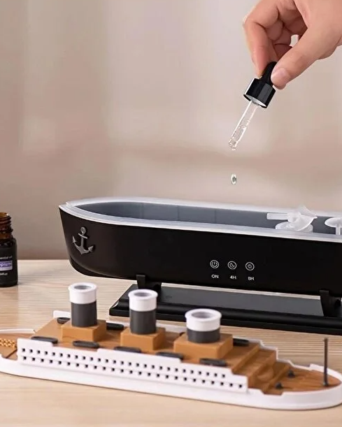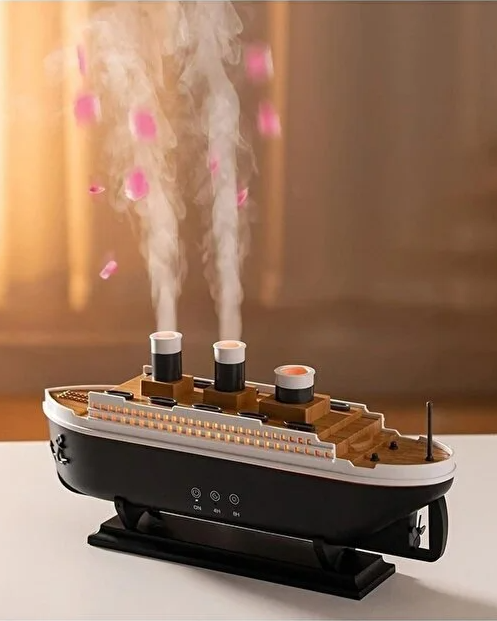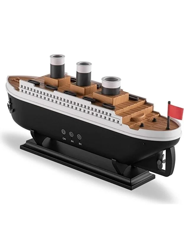 Titanic Gemi Aromaterapi Hava Nemlendirici Difüzör, zarif ve özgün tasarımıyla yalnızca bir nemlendirici değil, aynı zamanda dekoratif bir obje olarak da öne çıkar. Klasik Titanic gemisinden esinlenilen detaylarıyla masa üstünde adeta bir sanat eseri gibi dururken, havayı nemlendirir ve esansiyel yağlarla ortam havasını ferahlatır.