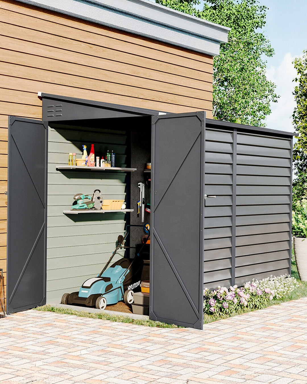 Geniş depolama hacmi: Büyük ölçüleri sayesinde bahçe ekipmanları ve farklı malzemelerin düzenli şekilde saklanmasına yardımcı olur.