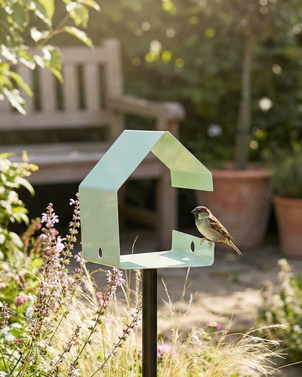 Açık hava koşullarında kullanım için tasarlanan bu ayaklı kuş yuvası, metal gövdesi ve toz statik boya kaplaması sayesinde dış etkenlere karşı dayanıklı bir kullanım sunar. Kompakt ölçüleri, bahçe, teras ve balkon gibi alanlarda rahatlıkla konumlandırmaya imkân verirken küçük kuşlar için güvenli bir barınma alanı oluşturur. Modern formu, bulunduğu ortama sade ve dekoratif bir görünüm kazandıracak şekilde tasarlanmıştır.